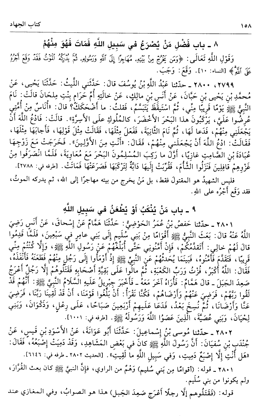 2801 - حَدَّثَنَا حَفْصُ بْنُ عُمَرَ الْحَوْضِىُّ حَدَّثَنَا هَمَّامٌ عَنْ إِسْحَاقَ عَنْ أَنَسٍ - رضى الله عنه - قَالَ بَعَثَ النَّبِىُّ - صلى الله عليه وسلم - أَقْوَامًا مِنْ بَنِى سُلَيْمٍ إِلَى بَنِى عَامِرٍ فِى سَبْعِينَ، فَلَمَّا قَدِمُوا، قَالَ لَهُمْ خَالِى أَتَقَدَّمُكُمْ، فَإِنْ أَمَّنُونِى حَتَّى أُبَلِّغَهُمْ عَنْ رَسُولِ اللَّهِ - صلى الله عليه وسلم - وَإِلاَّ كُنْتُمْ مِنِّى قَرِيبًا. فَتَقَدَّمَ، فَأَمَّنُوهُ، فَبَيْنَمَا يُحَدِّثُهُمْ عَنِ النَّبِىِّ - صلى الله عليه وسلم - إِذْ أَوْمَئُوا إِلَى رَجُلٍ مِنْهُمْ، فَطَعَنَهُ فَأَنْفَذَهُ فَقَالَ اللَّهُ أَكْبَرُ، فُزْتُ وَرَبِّ الْكَعْبَةِ. ثُمَّ مَالُوا عَلَى بَقِيَّةِ أَصْحَابِهِ فَقَتَلُوهُمْ، إِلاَّ رَجُلاً أَعْرَجَ صَعِدَ الْجَبَلَ. قَالَ هَمَّامٌ فَأُرَاهُ آخَرَ مَعَهُ، فَأَخْبَرَ جِبْرِيلُ - عَلَيْهِ السَّلاَمُ - النَّبِىَّ - صلى الله عليه وسلم - أَنَّهُمْ قَدْ لَقُوا رَبَّهُمْ، فَرَضِىَ عَنْهُمْ وَأَرْضَاهُمْ، فَكُنَّا نَقْرَأُ أَنْ بَلِّغُوا قَوْمَنَا أَنْ قَدْ لَقِينَا رَبَّنَا فَرَضِىَ عَنَّا وَأَرْضَانَا. ثُمَّ نُسِخَ بَعْدُ، فَدَعَا عَلَيْهِمْ أَرْبَعِينَ صَبَاحًا، عَلَى رِعْلٍ وَذَكْوَانَ وَبَنِى لِحْيَانَ وَبَنِى عُصَيَّةَ الَّذِينَ عَصَوُا اللَّهَ وَرَسُولَهُ - صلى الله عليه وسلم -. أطرافه 1001، 1002، 1003، 1300، 2814، 3064، 3170، 4088، 4089، 4090، 4091، 4092، 4094، 4095، 4096، 6394، 7341 - تحفة 217