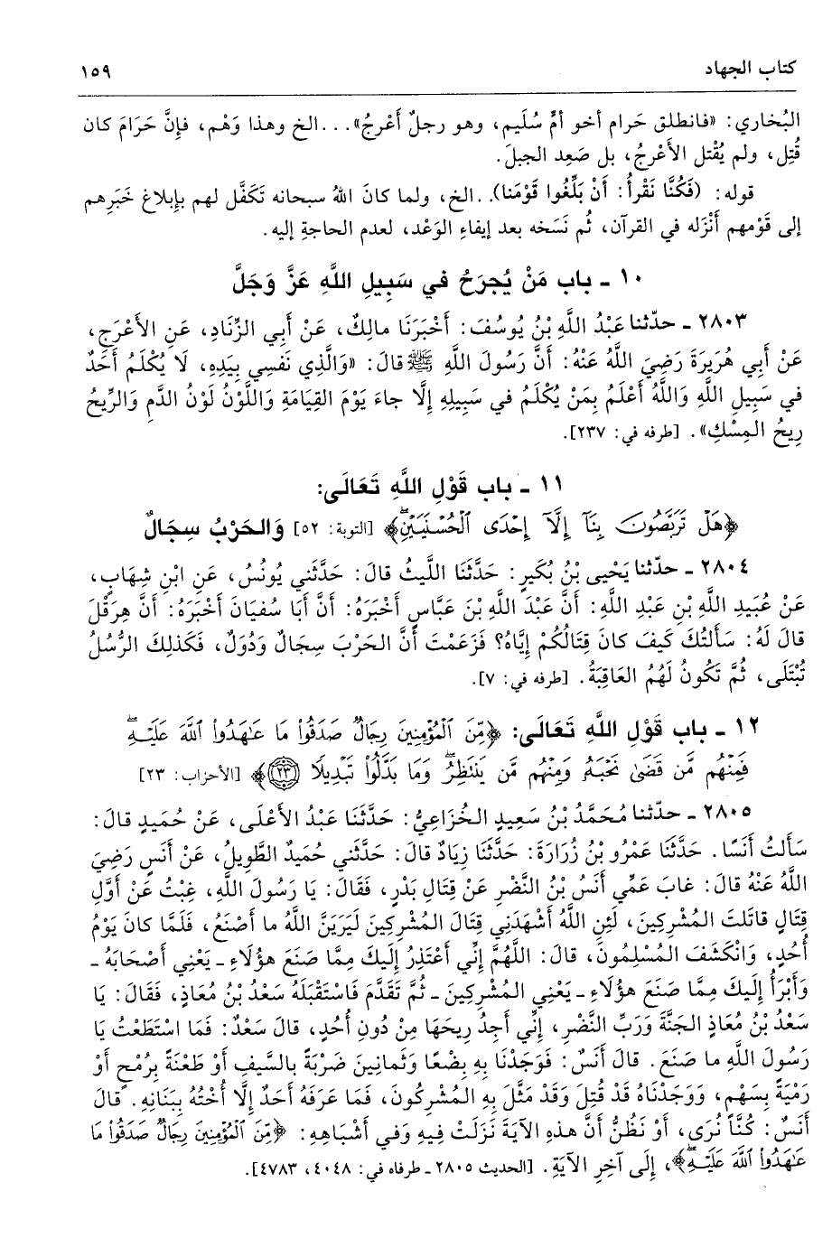 12 - باب قَوْلِ اللَّهِ تَعَالَى: {مِنَ الْمُؤْمِنِينَ رِجَالٌ صَدَقُوا مَا عَاهَدُوا اللَّهَ عَلَيْهِ فَمِنْهُمْ مَنْ قَضَى نَحْبَهُ وَمِنْهُمْ مَنْ يَنْتَظِرُ وَمَا بَدَّلُوا تَبْدِيلًا (23)} [الأحزاب: 23]