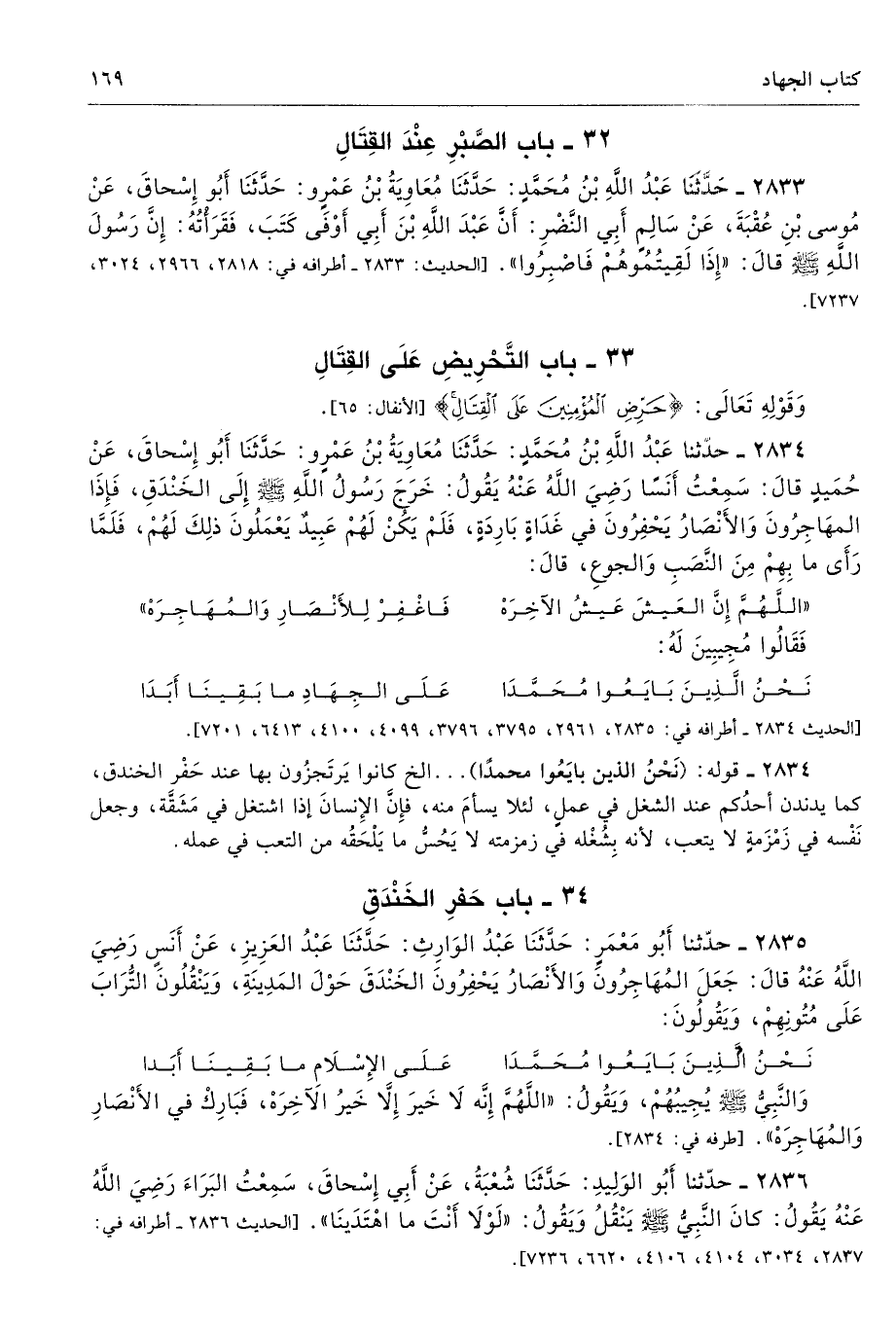 وَالنَّبِيُّ - صلى الله عليه وسلم - يُجِيبُهُمْ وَيَقُولُ اللَّهُمَّ إِنَّهُ لاَ خَيْرَ إِلاَّ خَيْرُ الآخِرَهْ فَبَارِكْ فِى الأَنْصَارِ وَالْمُهَاجِرَهْ. أطرافه 2834، 2961، 3795، 3796، 4099، 4100، 6413، 7201 تحفة 1043