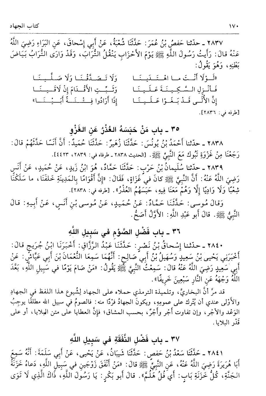 2839 - حَدَّثَنَا سُلَيْمَانُ بْنُ حَرْبٍ حَدَّثَنَا حَمَّادٌ - هُوَ ابْنُ زَيْدٍ - عَنْ حُمَيْدٍ عَنْ أَنَسٍ - رضى الله عنه - أَنَّ النَّبِىَّ - صلى الله عليه وسلم - كَانَ فِى غَزَاةٍ فَقَالَ «إِنَّ أَقْوَامًا بِالْمَدِينَةِ خَلْفَنَا، مَا سَلَكْنَا شِعْبًا وَلاَ وَادِيًا إِلاَّ وَهُمْ مَعَنَا فِيهِ، حَبَسَهُمُ الْعُذْرُ». طرفاه 2838، 4423 - تحفة 610