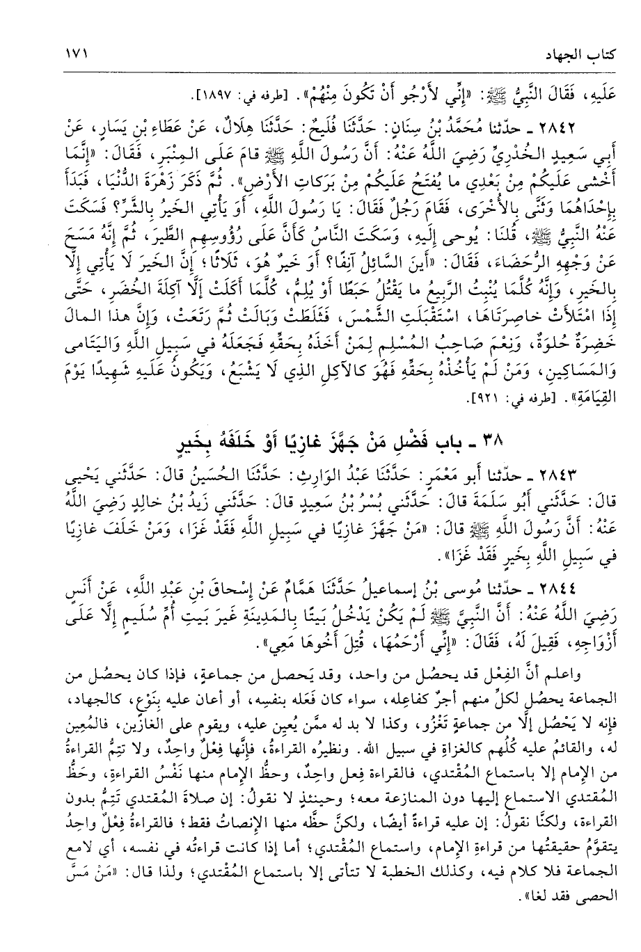 2843 - حَدَّثَنَا أَبُو مَعْمَرٍ حَدَّثَنَا عَبْدُ الْوَارِثِ حَدَّثَنَا الْحُسَيْنُ قَالَ حَدَّثَنِى يَحْيَى قَالَ حَدَّثَنِى أَبُو سَلَمَةَ قَالَ حَدَّثَنِى بُسْرُ بْنُ سَعِيدٍ قَالَ حَدَّثَنِى زَيْدُ بْنُ خَالِدٍ - رضى الله عنه - أَنَّ رَسُولَ اللَّهِ - صلى الله عليه وسلم - قَالَ «مَنْ جَهَّزَ غَازِيًا فِى سَبِيلِ اللَّهِ فَقَدْ غَزَا، وَمَنْ خَلَفَ غَازِيًا فِى سَبِيلِ اللَّهِ بِخَيْرٍ فَقَدْ غَزَا». تحفة 3747 - 33/ 4