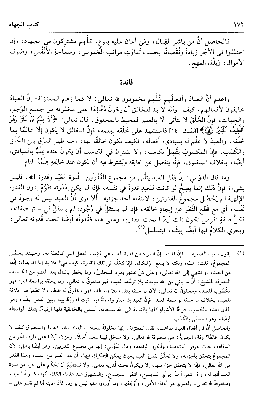 واعلم أنَّ العبادَ وأفعالَهم كُلُّهم مخلوقون لله تعالى: لا كما زعم المعتزلة؛ إنَّ العبادَ خالِقون لأفعالهم، كيف وأَنَّه لا بد للخالق أن يكونَ مُطَّلِعًا عنلى مخلوقة من جميع الوُجوه والجِهات، فإِنَّ الخَلْقَ لا يتأتى إلا بالعلم المحيط بالمخلوق. قال تعالى: {أَلَا يَعْلَمُ مَنْ خَلَقَ وَهُوَ اللَّطِيفُ الْخَبِيرُ (14)} [الملك: 14] فستشهد على خَلْقه بِعِلمه، فإِنَّ الخالق لا يكون إلا عالمًا بما خَلَقه، والعبدَ لا عِلْم له بمبادىء أَفعاله، فكيف يكون خالقًا لها، ومنه ظهر الفَرْق بين الخَلْق والكَسْب؛ فإِنَّ المكسوبَ يتَّصِلُ بكاسبه، ولا يُشْرط في الكاسب أن يكونَ عنده عِلْمٌ بالمبادىء أيضًا، بخلاف المخلوق، فإِنَّه ينفصل عن خالِقه ويُشترط فيه أن يكون عند خالِقِهِ عِلْمُهُ التام.