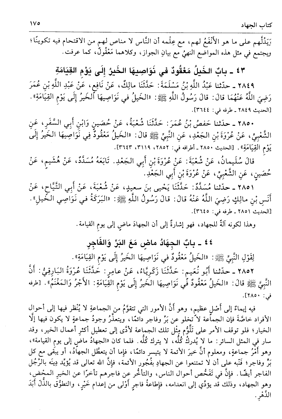 2849 - حَدَّثَنَا عَبْدُ اللَّهِ بْنُ مَسْلَمَةَ حَدَّثَنَا مَالِكٌ عَنْ نَافِعٍ عَنْ عَبْدِ اللَّهِ بْنِ عُمَرَ - رضى الله عنهما - قَالَ قَالَ رَسُولُ اللَّهِ - صلى الله عليه وسلم - «الْخَيْلُ فِى نَوَاصِيهَا الْخَيْرُ إِلَى يَوْمِ الْقِيَامَةِ». طرفه 3644 - تحفة 8377 - 34/ 4
