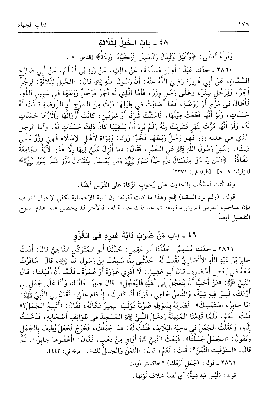 2860 - حَدَّثَنَا عَبْدُ اللَّهِ بْنُ مَسْلَمَةَ عَنْ مَالِكٍ عَنْ زَيْدِ بْنِ أَسْلَمَ عَنْ أَبِى صَالِحٍ السَّمَّانِ عَنْ أَبِى هُرَيْرَةَ - رضى الله عنه - أَنَّ رَسُولَ اللَّهِ - صلى الله عليه وسلم - قَالَ «الْخَيْلُ لِثَلاَثَةٍ لِرَجُلٍ أَجْرٌ، وَلِرَجُلٍ سِتْرٌ، وَعَلَى رَجُلٍ وِزْرٌ، فَأَمَّا الَّذِى لَهُ أَجْرٌ فَرَجُلٌ رَبَطَهَا فِى سَبِيلِ اللَّهِ، فَأَطَالَ فِى مَرْجٍ أَوْ رَوْضَةٍ، فَمَا أَصَابَتْ فِى طِيَلِهَا ذَلِكَ مِنَ الْمَرْجِ أَوِ الرَّوْضَةِ كَانَتْ لَهُ حَسَنَاتٍ، وَلَوْ أَنَّهَا قَطَعَتْ طِيَلَهَا فَاسْتَنَّتْ شَرَفًا أَوْ شَرَفَيْنِ كَانَتْ أَرْوَاثُهَا وَآثَارُهَا حَسَنَاتٍ لَهُ، وَلَوْ أَنَّهَا مَرَّتْ بِنَهَرٍ فَشَرِبَتْ مِنْهُ وَلَمْ يُرِدْ أَنْ يَسْقِيَهَا كَانَ ذَلِكَ حَسَنَاتٍ لَهُ، وَرَجُلٌ رَبَطَهَا فَخْرًا وَرِئَاءً وَنِوَاءً لأَهْلِ الإِسْلاَمِ فَهْىَ وِزْرٌ عَلَى ذَلِكَ». وَسُئِلَ رَسُولُ اللَّهِ - صلى الله عليه وسلم - عَنِ الْحُمُرِ، فَقَالَ «مَا أُنْزِلَ عَلَىَّ فِيهَا إِلاَّ هَذِهِ الآيَةُ الْجَامِعَةُ الْفَاذَّةُ {فَمَنْ يَعْمَلْ مِثْقَالَ ذَرَّةٍ خَيْرًا يَرَهُ (7) وَمَنْ يَعْمَلْ مِثْقَالَ ذَرَّةٍ شَرًّا يَرَهُ (8)} [الزلزلة: 7 - 8]. أطرافه 2371، 3646، 4962، 4963، 7356 - تحفة 12316 - 36/ 4