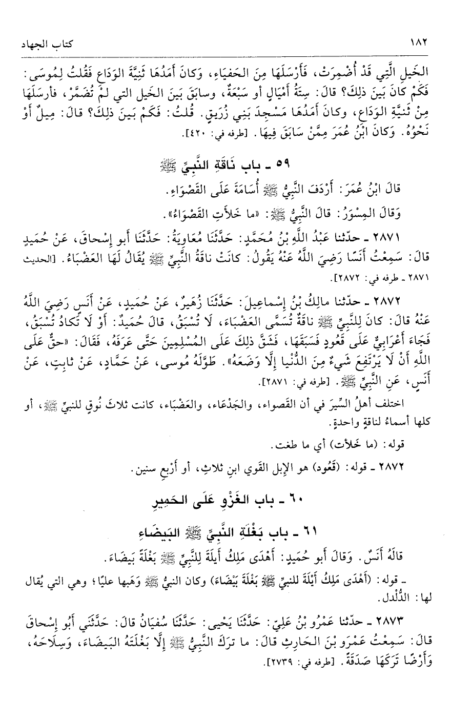 2871 - حَدَّثَنَا عَبْدُ اللَّهِ بْنُ مُحَمَّدٍ حَدَّثَنَا مُعَاوِيَةُ حَدَّثَنَا أَبُو إِسْحَاقَ عَنْ حُمَيْدٍ قَالَ سَمِعْتُ أَنَسًا - رضى الله عنه - يَقُولُ كَانَتْ نَاقَةُ النَّبِىِّ - صلى الله عليه وسلم - يُقَالُ لَهَا الْعَضْبَاءُ. طرفه 2872 - تحفة 562