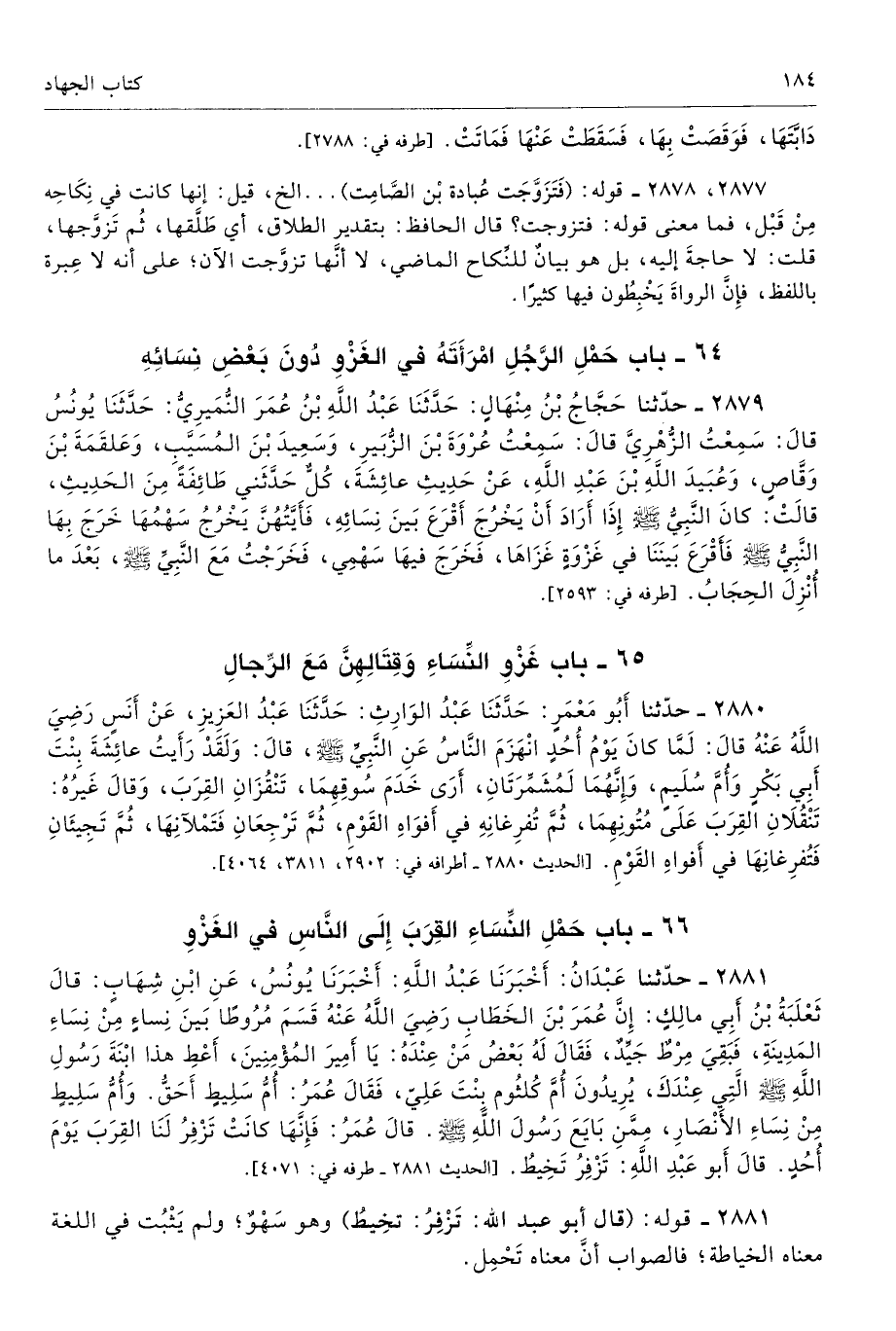 2879 - حَدَّثَنَا حَجَّاجُ بْنُ مِنْهَالٍ حَدَّثَنَا عَبْدُ اللَّهِ بْنُ عُمَرَ النُّمَيْرِىُّ حَدَّثَنَا يُونُسُ قَالَ سَمِعْتُ الزُّهْرِىَّ قَالَ سَمِعْتُ عُرْوَةَ بْنَ الزُّبَيْرِ وَسَعِيدَ بْنَ الْمُسَيَّبِ وَعَلْقَمَةَ بْنَ وَقَّاصٍ وَعُبَيْدَ اللَّهِ بْنَ عَبْدِ اللَّهِ عَنْ حَدِيثِ عَائِشَةَ، كُلٌّ حَدَّثَنِى طَائِفَةً مِنَ الْحَدِيثِ قَالَتْ كَانَ النَّبِىُّ - صلى الله عليه وسلم - إِذَا أَرَادَ أَنْ يَخْرُجَ أَقْرَعَ بَيْنَ نِسَائِهِ، فَأَيَّتُهُنَّ يَخْرُجُ سَهْمُهَا خَرَجَ بِهَا النَّبِىُّ - صلى الله عليه وسلم -، فَأَقْرَعَ بَيْنَنَا فِى غَزْوَةٍ غَزَاهَا، فَخَرَجَ فِيهَا سَهْمِى، فَخَرَجْتُ مَعَ النَّبِىِّ - صلى الله عليه وسلم - بَعْدَ مَا أُنْزِلَ الْحِجَابُ. أطرافه 2593، 2637، 2661، 2688، 4025، 4141، 4690، 4749، 4750، 4757، 5212، 6662، 6679، 7369، 7370، 7500، 7545 تحفة 16708، 16126، 17409، 16311