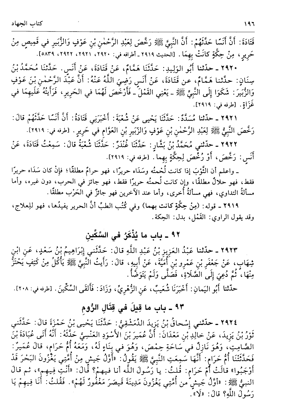 2920 - حَدَّثَنَا أَبُو الْوَلِيدِ حَدَّثَنَا هَمَّامٌ عَنْ قَتَادَةَ عَنْ أَنَسٍ حَدَّثَنَا مُحَمَّدُ بْنُ سِنَانٍ حَدَّثَنَا هَمَّامٌ عَنْ قَتَادَةَ عَنْ أَنَسٍ - رضى الله عنه - أَنَّ عَبْدَ الرَّحْمَنِ بْنَ عَوْفٍ وَالزُّبَيْرَ شَكَوَا إِلَى النَّبِىِّ - صلى الله عليه وسلم - يَعْنِى الْقَمْلَ - فَأَرْخَصَ لَهُمَا فِى الْحَرِيرِ، فَرَأَيْتُهُ عَلَيْهِمَا فِى غَزَاةٍ. أطرافه 2919، 2921، 2922، 5839 - تحفة 1394