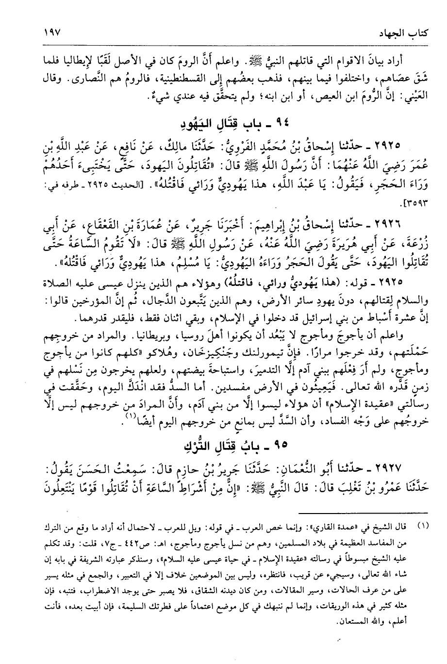 (¬1) قال الشيخ في "عمدة القاري": وإنما خص العرب -في قوله: ويل للعرب- لاحتمال أنه أراد ما وقع من الترك من المفاسد العظيمة في بلاد المسلمين، وهم من نسل يأجوج ومأجوج، اهـ: ص 442 - ج 7، قلت: وقد تكلم عليه الشيخ مبسوطًا في رسالته "عقيدة الإِسلام - في حياة عيسى عليه السلام"، وسنذكر عبارته الشريفة في بابه إن شاء الله تعالى، وسيجيء عن قريب، فانتظره، وليس بين الموضعين خلاف إلا في التعبير، والجمع في مثله يسير على من عرف الحالات، وسير المقالات، ومن كان ديدنه الشقاق، فلا يصبر حتى يوجد الاضطراب، فتنبه، فإن مثله كثير في هذه الوريقات، وإنما لم ننبهك في كل موضع اعتمادًا على فطرتك السليمة، فإن أبيت بعده، فأنت أعلم، والله المستعان.