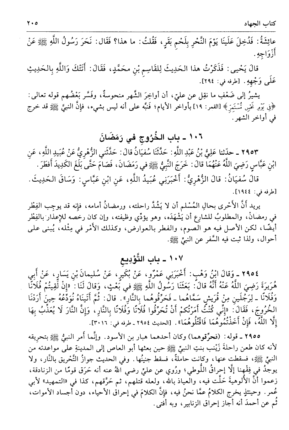2955 - قوله: (فحرِّقوهما) وكان أحدهما هبار بن الأسود. وإنَّما أَمْر النبيُّ صلى الله عليه وسلّم بتحرِيقه لأنه كان طعن راحلةَ زَيْنب بنتِ النبيِّ صلى الله عليه وسلّم حين بعثها أبو العاص إلى المدينةِ على مواعدته من النبيِّ صلى الله عليه وسلّم فسقطت عنها، وكانت حاملةً، فسقط جنينُها. وفي الحديث جوازُ التَّحْريق بالنَّار، ولا يوجدُ في فِقْهنا إلا إحراقُ اللُّوطي؛ ورُوي عن عليِّ رضي اللهُ عنه أنه حَرَق قومًا من الزنادقة، زعموا أنَّ الأُلوهيةَ حَلَّت فيه، والعياذ بالله، ولعله قتلهم، ثم حَرَّقهم، كذا في «التمهيد» لأبي عُمر. وحينئذٍ يخرج الكلامُ عمَّا نحنُ فيه، فإِنَّ الكلامَ في إحراق الأحياء، دون أجساد الأموات، ثُم عن أحمدَ أنه أجاز إحراق الزنابير، وبه أفتي.