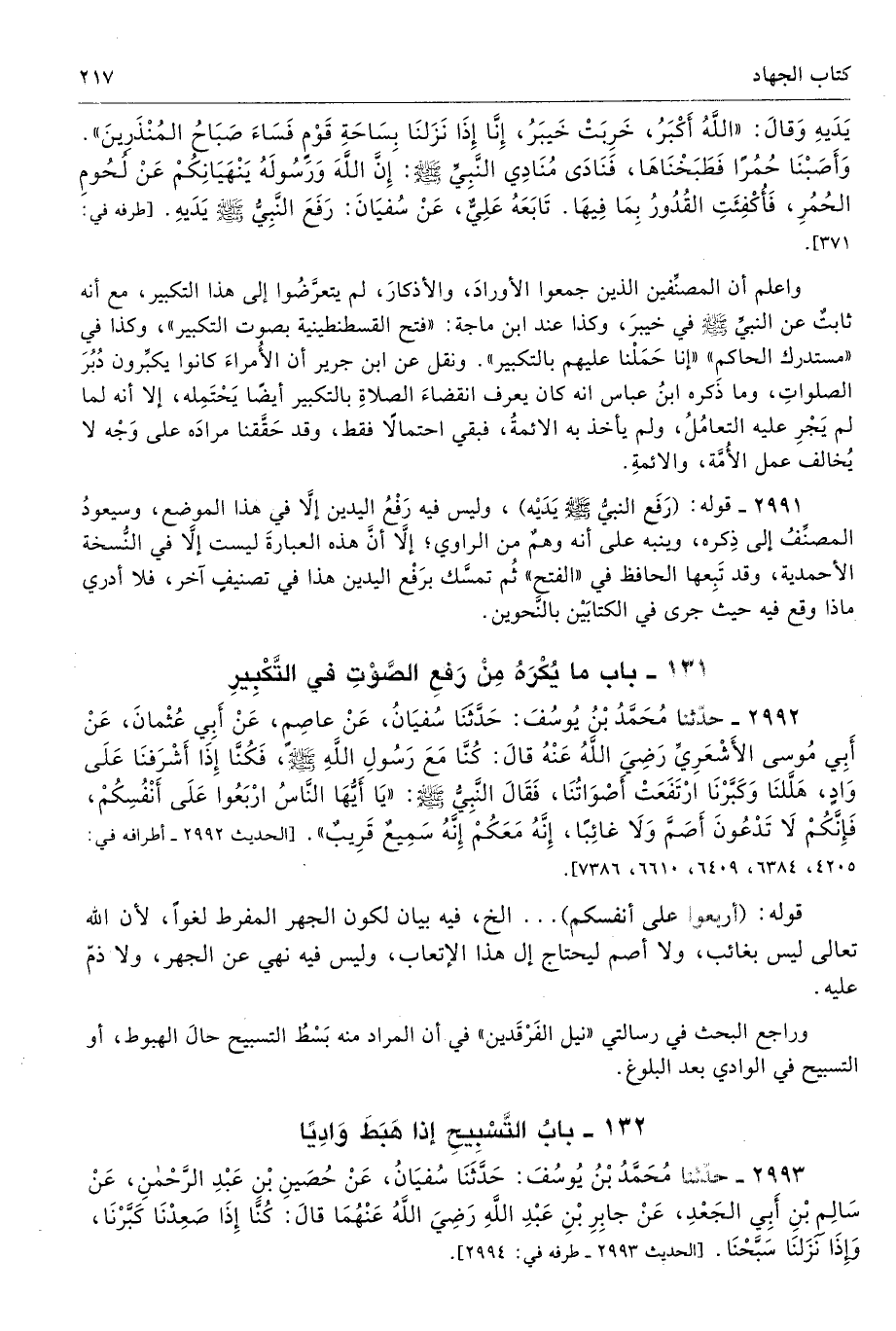 2991 - قوله: (رَفَع النبيُّ صلى الله عليه وسلّم يَدَيْه)، وليس فيه رَفْعُ اليدين إلا في هذا الموضع، وسيعودُ المصنِّفُ إلى ذِكره، وينبه على أنه وهمٌ من الراوي؛ إلا أنَّ هذه العبارةَ ليست إلا في النُّسخة الاحمدية، وقد تَبِعها الحافظ في «الفتح» ثُم تمسَّك برَفْع اليدين هذا في تصفيفٍ آخر، فلا أدري ماذا وقع فيه حيث جرى في الكتابَيْن بالنَّحوين.