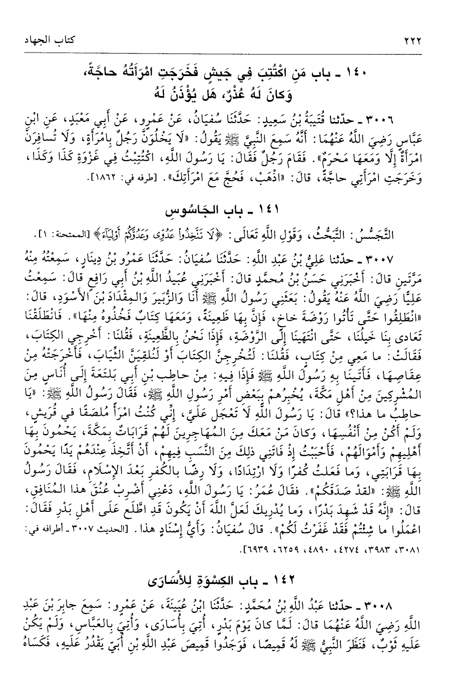 3008 - حَدَّثَنَا عَبْدُ اللَّهِ بْنُ مُحَمَّدٍ حَدَّثَنَا ابْنُ عُيَيْنَةَ عَنْ عَمْرٍو سَمِعَ جَابِرَ بْنَ عَبْدِ اللَّهِ - رضى الله عنهما - قَالَ لَمَّا كَانَ يَوْمَ بَدْرٍ أُتِىَ بِأُسَارَى، وَأُتِىَ بِالْعَبَّاسِ وَلَمْ يَكُنْ عَلَيْهِ ثَوْبٌ، فَنَظَرَ النَّبِىُّ - صلى الله عليه وسلم - لَهُ قَمِيصًا فَوَجَدُوا قَمِيصَ عَبْدِ اللَّهِ بْنِ أُبَىٍّ يَقْدُرُ عَلَيْهِ، فَكَسَاهُ