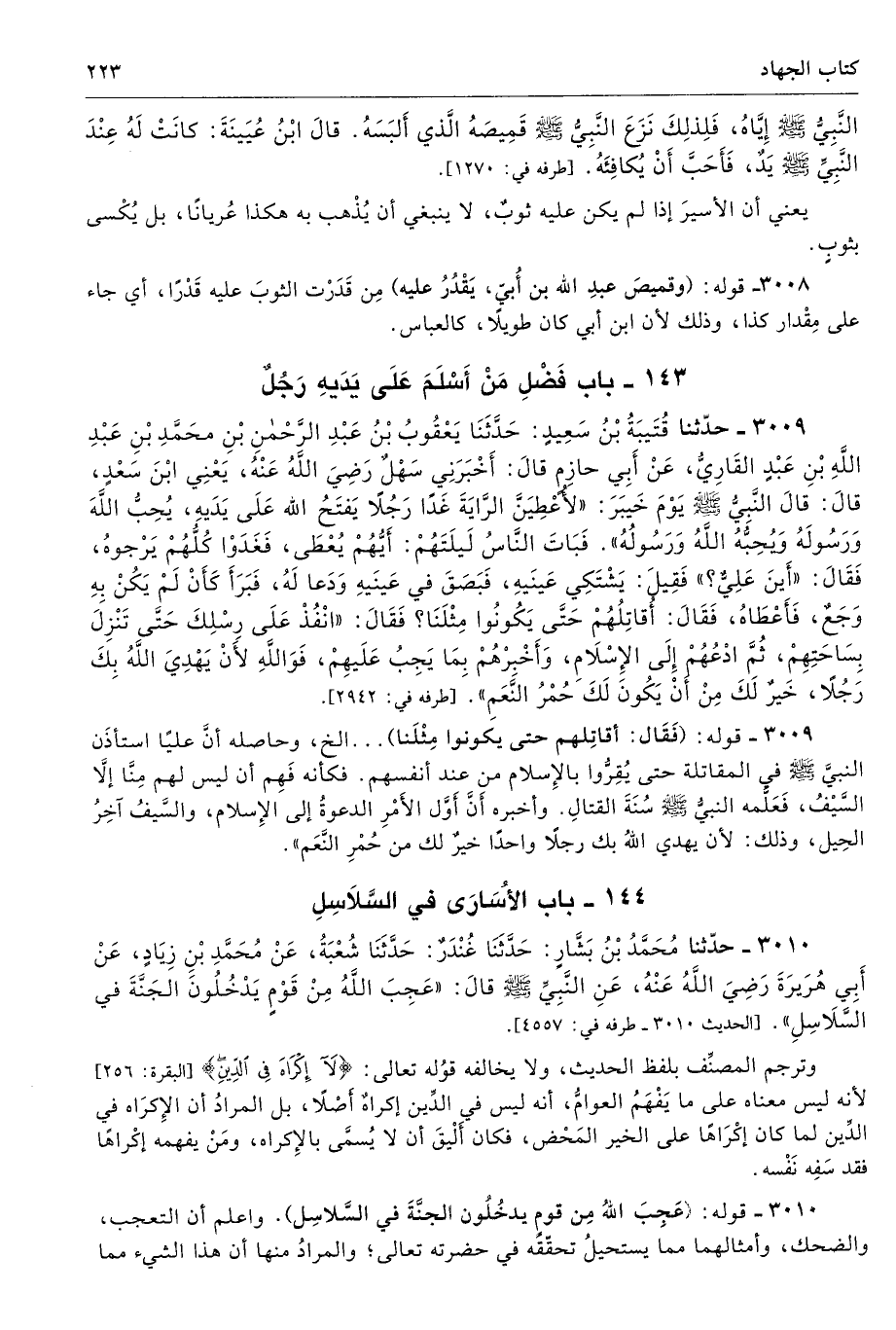 3010 - حَدَّثَنَا مُحَمَّدُ بْنُ بَشَّارٍ حَدَّثَنَا غُنْدَرٌ حَدَّثَنَا شُعْبَةُ عَنْ مُحَمَّدِ بْنِ زِيَادٍ عَنْ أَبِى هُرَيْرَةَ - رضى الله عنه - عَنِ النَّبِىِّ - صلى الله عليه وسلم - قَالَ «عَجِبَ اللَّهُ مِنْ قَوْمٍ يَدْخُلُونَ الْجَنَّةَ فِى السَّلاَسِلِ». طرفه 4557 - تحفة 14394