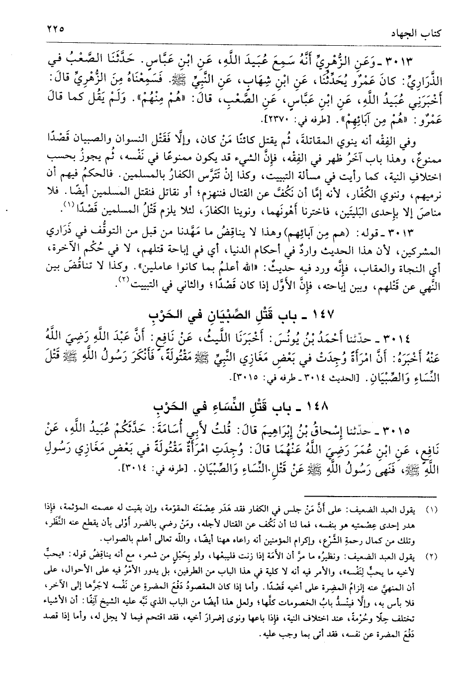 3015 - حَدَّثَنَا إِسْحَاقُ بْنُ إِبْرَاهِيمَ قَالَ قُلْتُ لأَبِى أُسَامَةَ حَدَّثَكُمْ عُبَيْدُ اللَّهِ عَنْ نَافِعٍ عَنِ ابْنِ عُمَرَ - رضى الله عنهما - قَالَ وُجِدَتِ امْرَأَةٌ مَقْتُولَةً فِى بَعْضِ مَغَازِى رَسُولِ اللَّهِ - صلى الله عليه وسلم -، فَنَهَى رَسُولُ اللَّهِ - صلى الله عليه وسلم - عَنْ قَتْلِ النِّسَاءِ وَالصِّبْيَانِ. طرفه 3014 - تحفة 7830