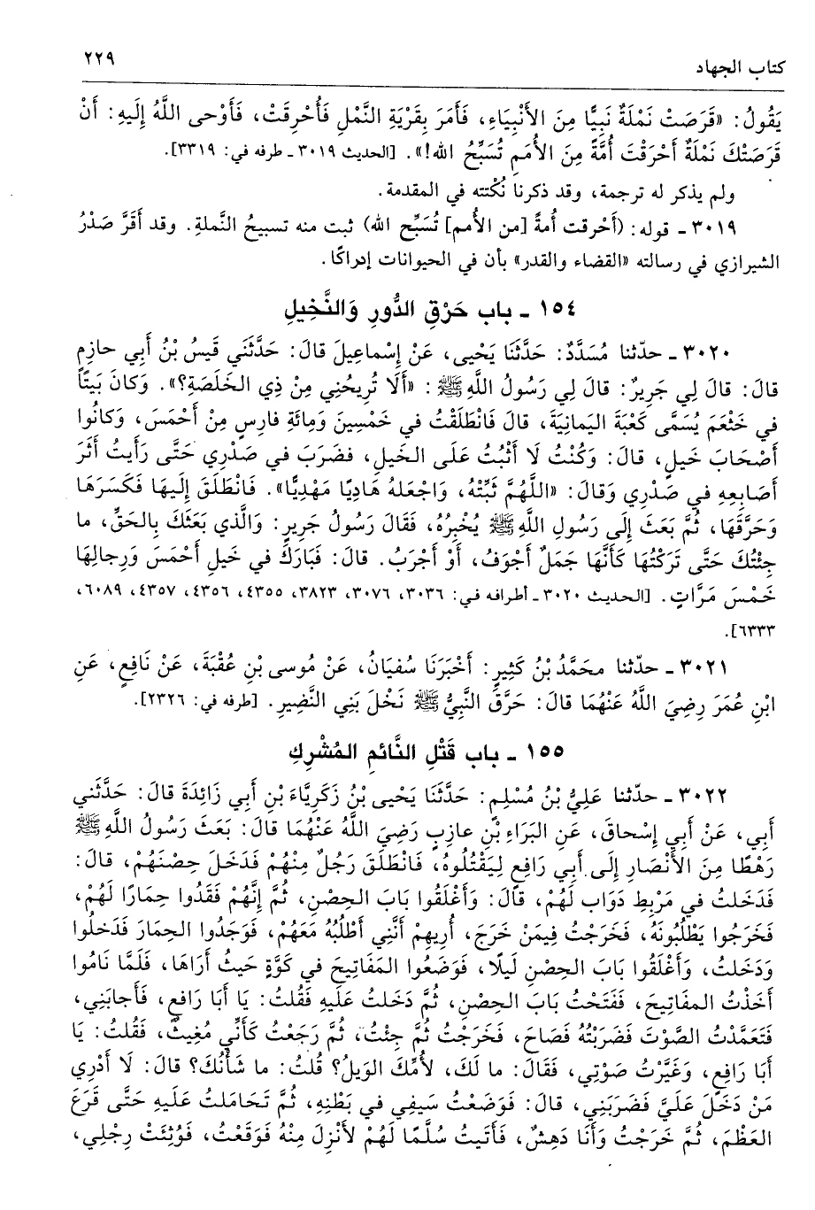 3021 - حَدَّثَنَا مُحَمَّدُ بْنُ كَثِيرٍ أَخْبَرَنَا سُفْيَانُ عَنْ مُوسَى بْنِ عُقْبَةَ عَنْ نَافِعٍ عَنِ ابْنِ عُمَرَ - رضى الله عنهما - قَالَ حَرَّقَ النَّبِىُّ - صلى الله عليه وسلم - نَخْلَ بَنِى النَّضِيرِ. أطرافه 2326، 4031، 4032، 4884 - تحفة 8457