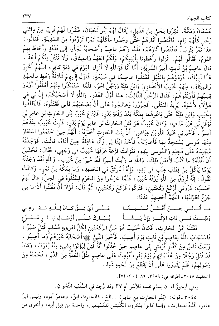 عُسْفَانَ وَمَكَّةَ ذُكِرُوا لِحَىٍّ مِنْ هُذَيْلٍ يُقَالُ لَهُمْ بَنُو لِحْيَانَ، فَنَفَرُوا لَهُمْ قَرِيبًا مِنْ مِائَتَىْ رَجُلٍ، كُلُّهُمْ رَامٍ، فَاقْتَصُّوا آثَارَهُمْ حَتَّى وَجَدُوا مَأْكَلَهُمْ تَمْرًا تَزَوَّدُوهُ مِنَ الْمَدِينَةِ فَقَالُوا هَذَا تَمْرُ يَثْرِبَ. فَاقْتَصُّوا آثَارَهُمْ، فَلَمَّا رَآهُمْ عَاصِمٌ وَأَصْحَابُهُ لَجَئُوا إِلَى فَدْفَدٍ، وَأَحَاطَ بِهِمُ الْقَوْمُ فَقَالُوا لَهُمُ انْزِلُوا وَأَعْطُونَا بِأَيْدِيكُمْ، وَلَكُمُ الْعَهْدُ وَالْمِيثَاقُ، وَلاَ نَقْتُلُ مِنْكُمْ أَحَدًا. قَالَ عَاصِمُ بْنُ ثَابِتٍ أَمِيرُ السَّرِيَّةِ أَمَّا أَنَا فَوَاللَّهِ لاَ أَنْزِلُ الْيَوْمَ فِى ذِمَّةِ كَافِرٍ، اللَّهُمَّ أَخْبِرْ عَنَّا نَبِيَّكَ. فَرَمَوْهُمْ بِالنَّبْلِ، فَقَتَلُوا عَاصِمًا فِى سَبْعَةٍ، فَنَزَلَ إِلَيْهِمْ ثَلاَثَةُ رَهْطٍ بِالْعَهْدِ وَالْمِيثَاقِ، مِنْهُمْ خُبَيْبٌ الأَنْصَارِىُّ وَابْنُ دَثِنَةَ وَرَجُلٌ آخَرُ، فَلَمَّا اسْتَمْكَنُوا مِنْهُمْ أَطْلَقُوا أَوْتَارَ قِسِيِّهِمْ فَأَوْثَقُوهُمْ فَقَالَ الرَّجُلُ الثَّالِثُ هَذَا أَوَّلُ الْغَدْرِ، وَاللَّهِ لاَ أَصْحَبُكُمْ، إِنَّ فِى هَؤُلاَءِ لأُسْوَةً. يُرِيدُ الْقَتْلَى، فَجَرَّرُوهُ وَعَالَجُوهُ عَلَى أَنْ يَصْحَبَهُمْ فَأَبَى فَقَتَلُوهُ، فَانْطَلَقُوا بِخُبَيْبٍ وَابْنِ دَثِنَةَ حَتَّى بَاعُوهُمَا بِمَكَّةَ بَعْدَ وَقْعَةِ بَدْرٍ، فَابْتَاعَ خُبَيْبًا بَنُو الْحَارِثِ بْنِ عَامِرِ بْنِ نَوْفَلِ بْنِ عَبْدِ مَنَافٍ، وَكَانَ خُبَيْبٌ هُوَ قَتَلَ الْحَارِثَ بْنَ عَامِرٍ يَوْمَ بَدْرٍ، فَلَبِثَ خُبَيْبٌ عِنْدَهُمْ أَسِيرًا، فَأَخْبَرَنِى عُبَيْدُ اللَّهِ بْنُ عِيَاضٍ أَنَّ بِنْتَ الْحَارِثِ أَخْبَرَتْهُ أَنَّهُمْ حِينَ اجْتَمَعُوا اسْتَعَارَ مِنْهَا مُوسَى يَسْتَحِدُّ بِهَا فَأَعَارَتْهُ، فَأَخَذَ ابْنًا لِى وَأَنَا غَافِلَةٌ حِينَ أَتَاهُ قَالَتْ فَوَجَدْتُهُ مُجْلِسَهُ عَلَى فَخِذِهِ وَالْمُوسَى بِيَدِهِ، فَفَزِعْتُ فَزْعَةً عَرَفَهَا خُبَيْبٌ فِى وَجْهِى فَقَالَ تَخْشَيْنَ أَنْ أَقْتُلَهُ مَا كُنْتُ لأَفْعَلَ ذَلِكَ.