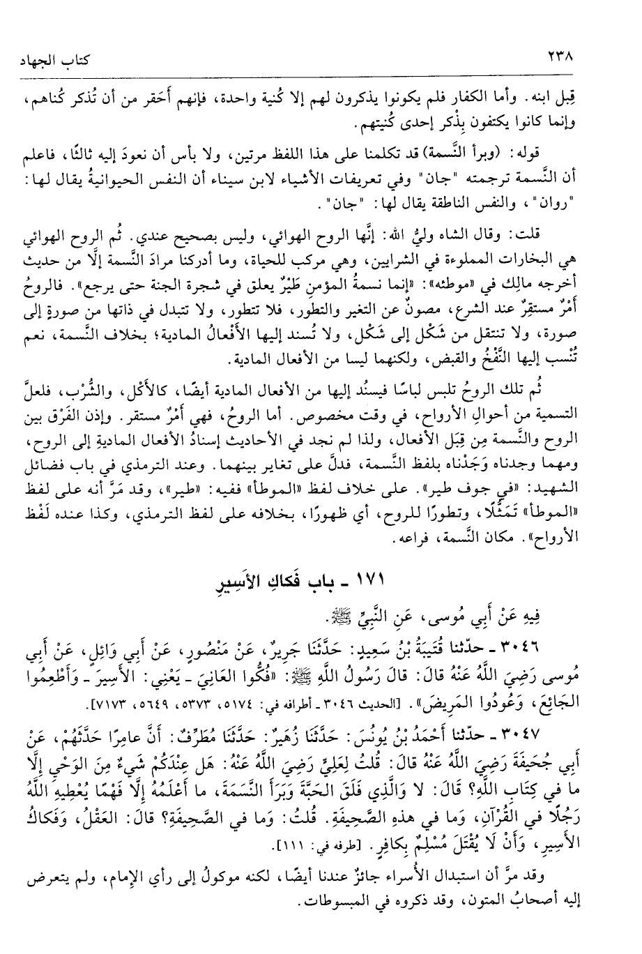 ثُم تلك الروحُ تلبس لباسًا فيسنُد إليها من لأفعال المادية أيضًا، كالأَكْل، والشُّرْب، فلعلَّ التسمةَ من أحوالِ الأرواح، في وقت مخصوص. أما الروحُ، فهي أَمْرٌ مستقر. وإذن الفَرْق بين الروح والنَّسمة مِن قِبَل الأفعال، ولذا لم نجد في الأحاديث إسنادُ الأفعال الماديةِ إلى الروح، ومهما وجدناه وَجَدْناه بلفظ النَّسمة، فدلَّ على تغاير بينهما. وعند الترمذي في باب فضائل الشهيد: «في جوف طير». على خلاف لفظ «الموطأ» ففيه: «طير»، وقد مَرَّ أنه على لفظ «الموطأ» تَمَثُّلا، وتطورًا للروح، أي ظهورًا، بخلافه على لفظ الترمذي، وكذا عند لَفْظ الأرواح». مكان النَّسمة، فراعه.