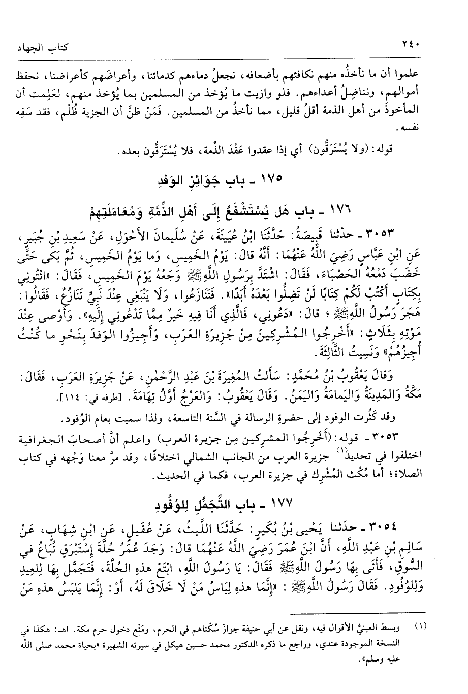 3053 - قوله: (أَخْرِجُوا المشرِكين مِن جزيرة العرب) واعلم أنَّ أصحابَ الجغرافية اختلفوا في تحديد (¬1) جزيرة العرب من الجانب الشمالي اختلافًا، وقد مرَّ معنا وَجْهه في كتاب الصلاة؛ أما مُكْث المُشْرِك في جزيرة العرب، فكما في الحديث.