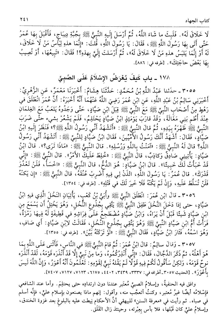 3055 - حَدَّثَنَا عَبْدُ اللَّهِ بْنُ مُحَمَّدٍ حَدَّثَنَا هِشَامٌ أَخْبَرَنَا مَعْمَرٌ عَنِ الزُّهْرِىِّ أَخْبَرَنِى سَالِمُ بْنُ عَبْدِ اللَّهِ عَنِ ابْنِ عُمَرَ - رضى الله عنهما - أَنَّهُ أَخْبَرَهُ أَنَّ عُمَرَ انْطَلَقَ فِى رَهْطٍ مِنْ أَصْحَابِ النَّبِىِّ - صلى الله عليه وسلم - مَعَ النَّبِىِّ - صلى الله عليه وسلم - قِبَلَ ابْنِ صَيَّادٍ حَتَّى وَجَدُوهُ يَلْعَبُ مَعَ الْغِلْمَانِ عِنْدَ أُطُمِ بَنِى مَغَالَةَ، وَقَدْ قَارَبَ يَوْمَئِذٍ ابْنُ صَيَّادٍ يَحْتَلِمُ، فَلَمْ يَشْعُرْ حَتَّى ضَرَبَ النَّبِىُّ - صلى الله عليه وسلم - ظَهْرَهُ بِيَدِهِ ثُمَّ قَالَ النَّبِىُّ - صلى الله عليه وسلم - «أَتَشْهَدُ أَنِّى رَسُولُ اللَّهِ - صلى الله عليه وسلم -». فَنَظَرَ إِلَيْهِ ابْنُ صَيَّادٍ فَقَالَ أَشْهَدُ أَنَّكَ رَسُولُ الأُمِّيِّينَ. فَقَالَ ابْنُ صَيَّادٍ لِلنَّبِىِّ - صلى الله عليه وسلم - أَتَشْهَدُ أَنِّى رَسُولُ اللَّهِ. قَالَ لَهُ النَّبِىُّ - صلى الله عليه وسلم - «آمَنْتُ بِاللَّهِ وَرُسُلِهِ» قَالَ النَّبِىُّ - صلى الله عليه وسلم - «مَاذَا تَرَى». قَالَ ابْنُ صَيَّادٍ يَأْتِينِى صَادِقٌ وَكَاذِبٌ. قَالَ النَّبِىُّ - صلى الله عليه وسلم - «خُلِطَ عَلَيْكَ الأَمْرُ». قَالَ النَّبِىُّ - صلى الله عليه وسلم - «إِنِّى قَدْ خَبَأْتُ لَكَ خَبِيئًا». قَالَ ابْنُ صَيَّادٍ هُوَ الدُّخُّ. قَالَ النَّبِىُّ - صلى الله عليه وسلم - «اخْسَأْ فَلَنْ تَعْدُوَ قَدْرَكَ». قَالَ عُمَرُ يَا رَسُولَ اللَّهِ، ائْذَنْ لِى فِيهِ أَضْرِبْ عُنُقَهُ. قَالَ النَّبِىُّ - صلى الله عليه وسلم - «إِنْ يَكُنْهُ فَلَنْ تُسَلَّطَ عَلَيْهِ، وَإِنْ لَمْ يَكُنْهُ فَلاَ خَيْرَ لَكَ فِى قَتْلِهِ». أطرافه 1354، 6173، 6618 - تحفة 6932 - 86/ 4