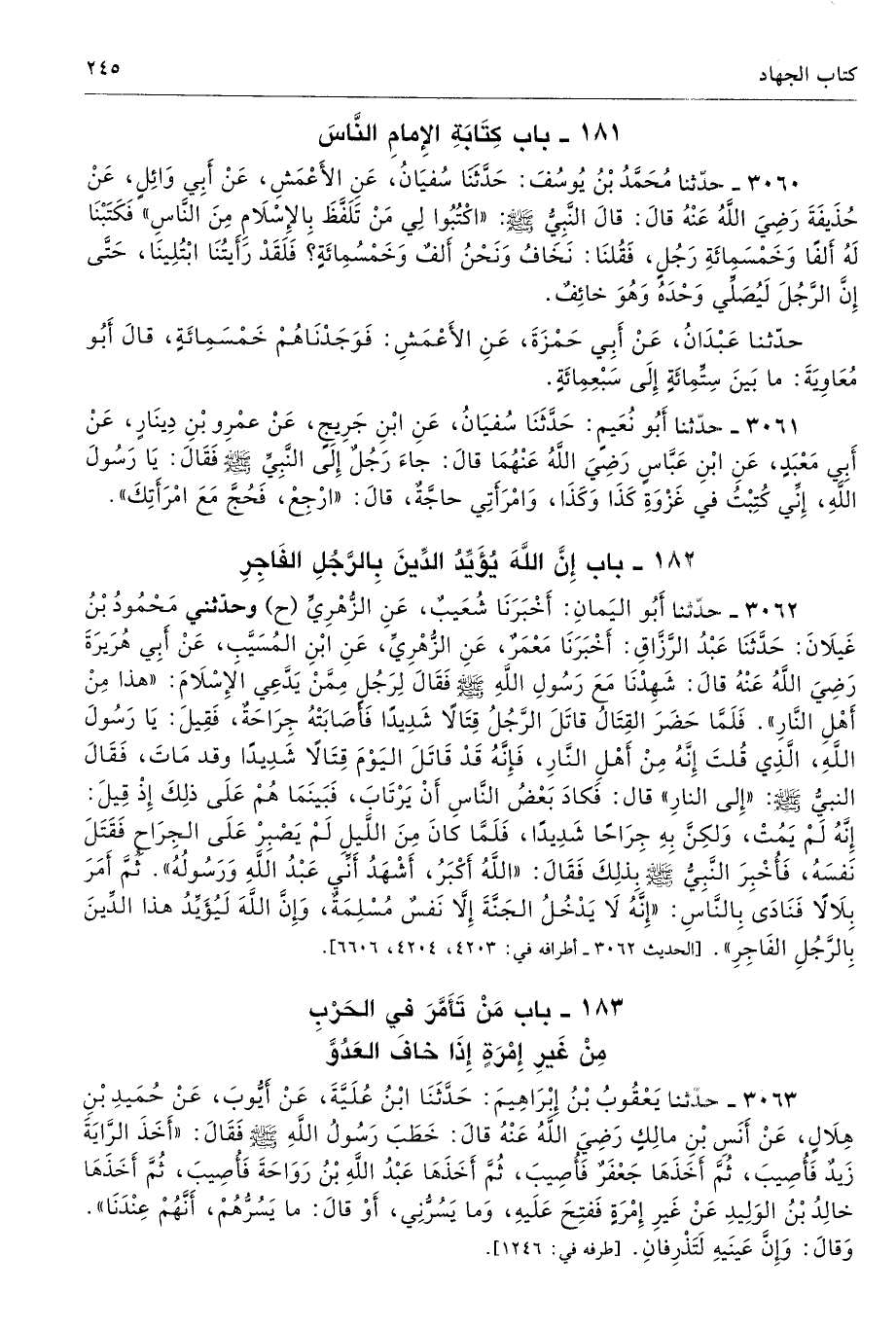 3063 - حَدَّثَنَا يَعْقُوبُ بْنُ إِبْرَاهِيمَ حَدَّثَنَا ابْنُ عُلَيَّةَ عَنْ أَيُّوبَ عَنْ حُمَيْدِ بْنِ هِلاَلٍ عَنْ أَنَسِ بْنِ مَالِكٍ - رضى الله عنه - قَالَ خَطَبَ رَسُولُ اللَّهِ - صلى الله عليه وسلم - فَقَالَ «أَخَذَ الرَّايَةَ زَيْدٌ فَأُصِيبَ، ثُمَّ أَخَذَهَا جَعْفَرٌ فَأُصِيبَ، ثُمَّ أَخَذَهَا عَبْدُ اللَّهِ بْنُ رَوَاحَةَ فَأُصِيبَ، ثُمَّ أَخَذَهَا خَالِدُ بْنُ الْوَلِيدِ عَنْ غَيْرِ إِمْرَةٍ فَفُتِحَ عَلَيْهِ، وَمَا يَسُرُّنِى - أَوْ قَالَ مَا يَسُرُّهُمْ - أَنَّهُمْ عِنْدَنَا». وَقَالَ وَإِنَّ عَيْنَيْهِ لَتَذْرِفَانِ. أطرافه 1246، 2798، 3630، 3757، 4262 - تحفة 820