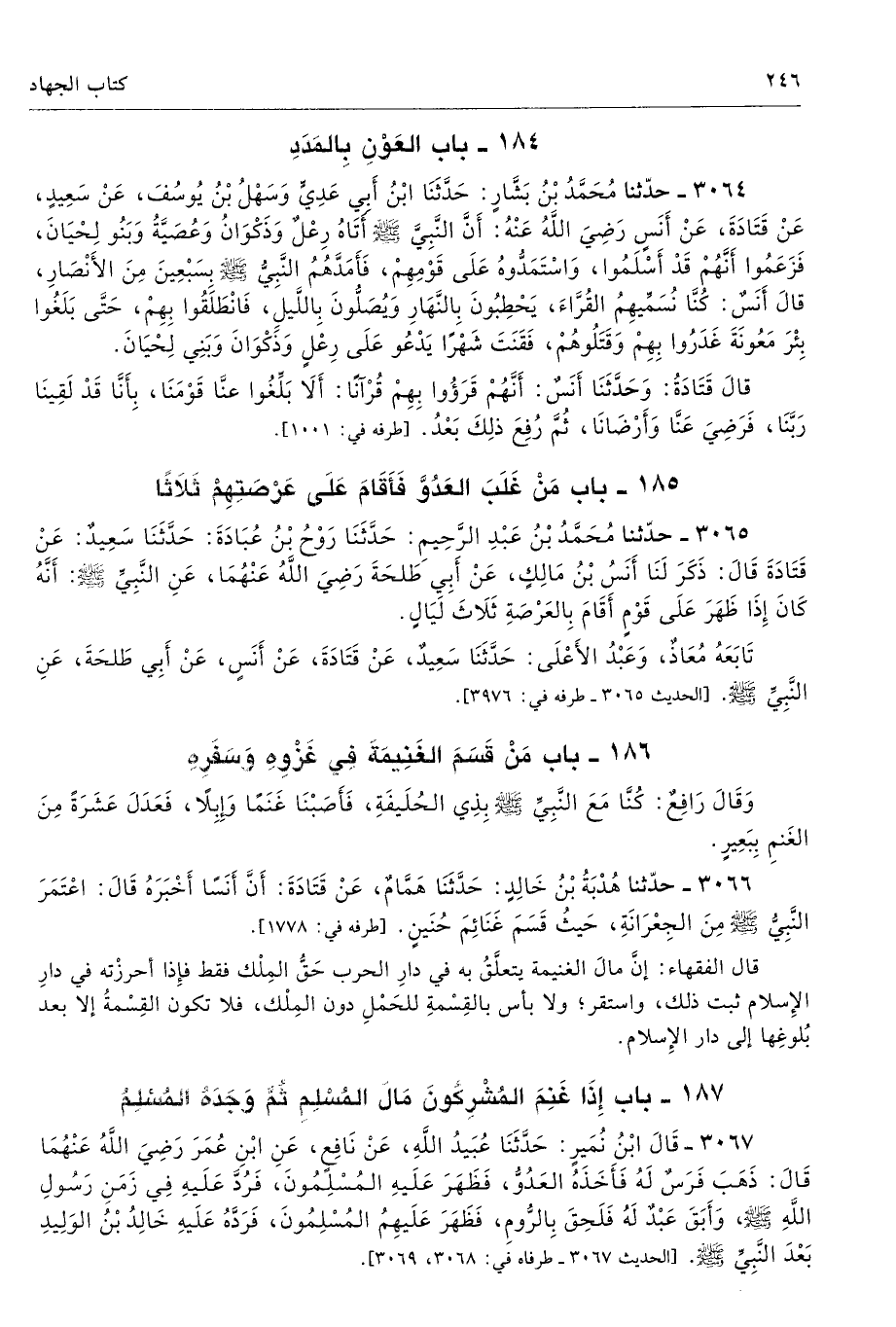 3066 - حَدَّثَنَا هُدْبَةُ بْنُ خَالِدٍ حَدَّثَنَا هَمَّامٌ عَنْ قَتَادَةَ أَنَّ أَنَسًا أَخْبَرَهُ قَالَ اعْتَمَرَ النَّبِىُّ - صلى الله عليه وسلم - مِنَ الْجِعْرَانَةِ، حَيْثُ قَسَمَ غَنَائِمَ حُنَيْنٍ. أطرافه 1778، 1779، 1780، 4148 - تحفة 1393، 1416