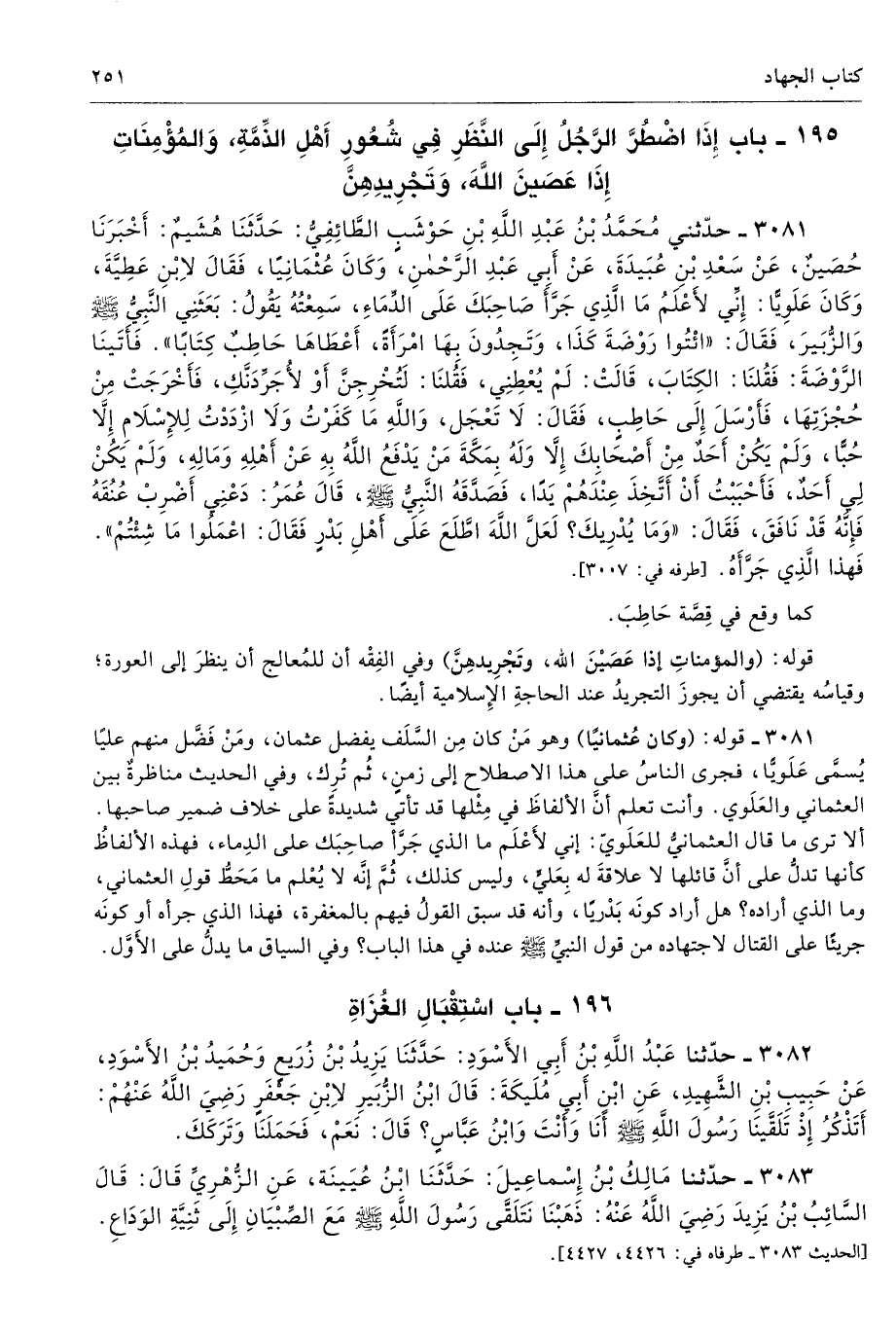3081 - قوله: (وكان عُثمانيًا) وهو مَنْ كان مِن السَّلَف يفضل عثمان، ومَنْ فَضَّل منهم عليًا يُسمَّى عَلَويَّا، فجرى الناسُ على هذا الاصطلاح إلى زمنٍ، ثُم تُرِك، وفي الحديث مناظرةٌ بين العثماني والعَلَوي. وأنت تعلم أنَّ الألفاظَ في مِثْلها قد تأتي شديدةً على خلاف ضمير صاحبها. ألا ترى ما قال العثمانيُّ للعَلَويّ: إن لأَعْلَم ما الذي جَرَّأ صاحِبَك على الدِماء، فهذه الألفاظُ كأنها تدلُّ على أنَّ قائلها لا علاقةُ له بِعَليَ، وليس كذلك، ثُمَّ إنَّه لا يُعْلم ما مَحَطُّ قولِ العثماني، وما الذي أراده؟ هل أراد كونَه بَدْريًا، وأنه قد سبق القولُ فيهم بالغفرة، فهذا الذي جرأه أَم كونَه جريئًا على القتال لاجتهاده من قول النبيِّ صلى الله عليه وسلّم عنده في الباب؟ وفي السياق ما يدلُّ على الأَوَّل.