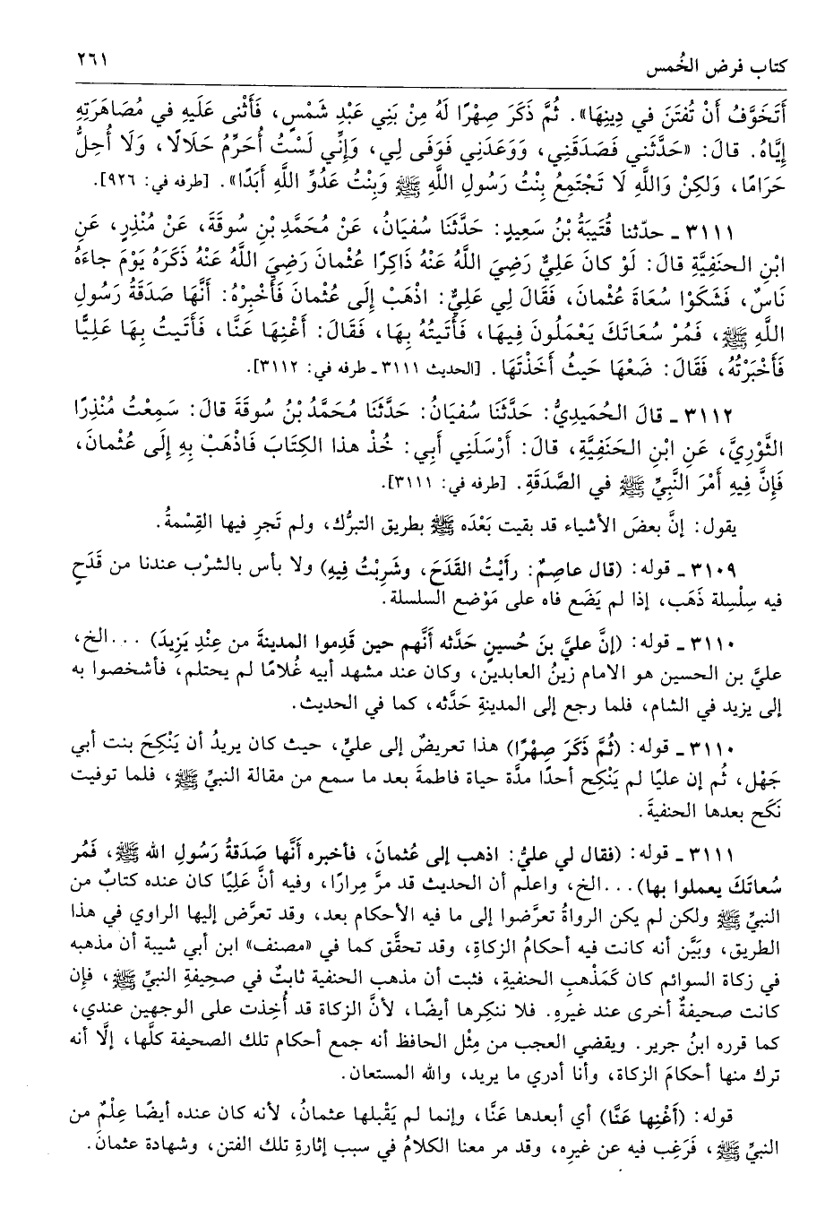 3111 - حَدَّثَنَا قُتَيْبَةُ بْنُ سَعِيدٍ حَدَّثَنَا سُفْيَانُ عَنْ مُحَمَّدِ بْنِ سُوقَةَ عَنْ مُنْذِرٍ عَنِ ابْنِ الْحَنَفِيَّةِ قَالَ لَوْ كَانَ عَلِىٌّ - رضى الله عنه - ذَاكِرًا عُثْمَانَ - رضى الله عنه - ذَكَرَهُ يَوْمَ جَاءَهُ نَاسٌ فَشَكَوْا سُعَاةَ عُثْمَانَ، فَقَالَ لِى عَلِىٌّ اذْهَبْ إِلَى عُثْمَانَ فَأَخْبِرْهُ أَنَّهَا صَدَقَةُ رَسُولِ اللَّهِ - صلى الله عليه وسلم -، فَمُرْ سُعَاتَكَ يَعْمَلُونَ فِيهَا. فَأَتَيْتُهُ بِهَا فَقَالَ أَغْنِهَا عَنَّا. فَأَتَيْتُ بِهَا عَلِيًّا فَأَخْبَرْتُهُ فَقَالَ ضَعْهَا حَيْثُ أَخَذْتَهَا. طرفه 3112 - تحفة 10268