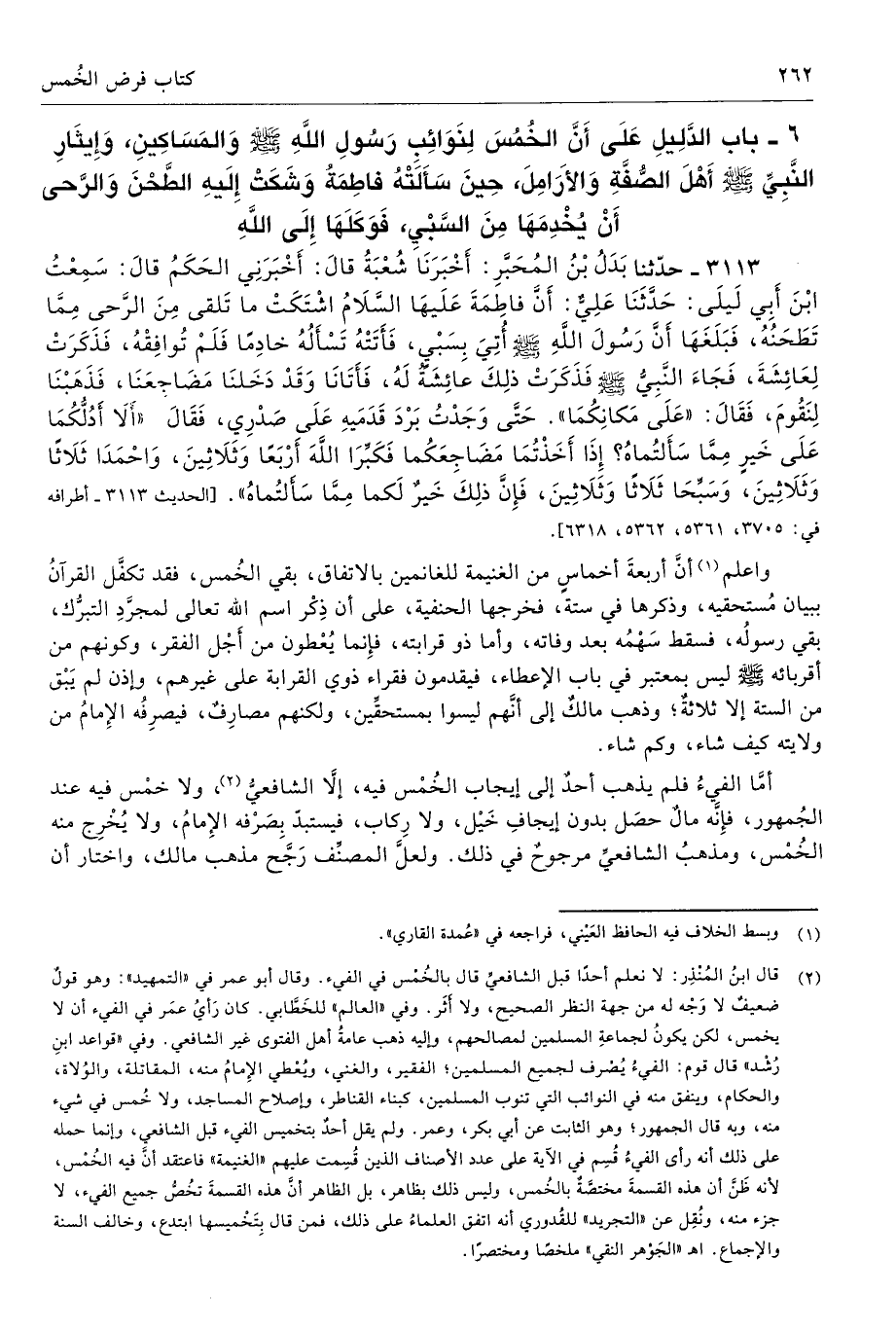 (¬2) قال ابنُ المُنْذِر: لا نعلم أحدًا قبل الشافعيِّ قال بالخُمس في الفيء. وقال أبو عمر في "التمهيد": وهو قولٌ ضعيفٌ لا وَجْه له من جهة النظر الصحيح، ولا أَثَر. وفي "العالم" للخَطَّابي. كان رَأيُ عمَر في الفيء أن لا يخمس، لكن يكونُ لجماعةِ المسلمين لمصالحهم، وإليه ذهب عامةُ أهل الفتوى غير الشافعي. وفي "قواعد ابنِ رُشْد" قال قوم: الفيءُ يُصْرف لجميع المسلمين؛ الفقير، والغني، وُيعْطي الإِمامُ منه، المقاتلة، والوُلاة، والحكام، وينفق منه في النوائب التي تنوب المسلمين، كبناء القناطر، وإصلاح المساجد، ولا خُمس في شيء منه، وبه قال الجمهور؛ وهو الثابت عن أبي بكر، وعمر. ولم يقل أحدٌ بتخميس الفيء قبل الشافعي، وإنما حمله على ذلك أنه رأى الفيءُ قُسِم في الآية على عدد الأصناف الذين قُسِمت عليهم "الغنيمة" فاعتقد أنَّ فيه الخُمْس، لأنه ظَن أن هذه القسمةَ مختصَّةٌ بالخُمس، وليس ذلك بظاهر، بل الظاهر أن هذه القسمةَ تخُصُّ جميع الفيء، لا جزء منه، ونُقِل عن "التجريد" للقُدوري أنه اتفق العلماءُ على ذلك، فمن قال بِتَخْميسها ابتدع، وخالف السنة والإجماع. اهـ "الجَوْهر النقي" ملخصًا ومختصرًا.