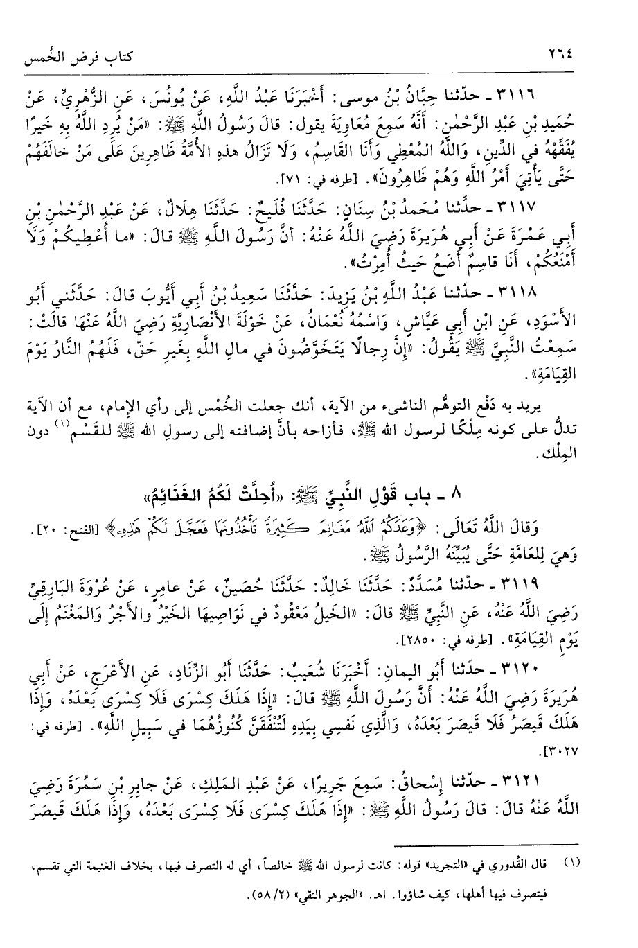 3119 - حَدَّثَنَا مُسَدَّدٌ حَدَّثَنَا خَالِدٌ حَدَّثَنَا حُصَيْنٌ عَنْ عَامِرٍ عَنْ عُرْوَةَ الْبَارِقِىِّ - رضى الله عنه - عَنِ النَّبِىِّ - صلى الله عليه وسلم - قَالَ «الْخَيْلُ مَعْقُودٌ فِى نَوَاصِيهَا الْخَيْرُ الأَجْرُ وَالْمَغْنَمُ إِلَى يَوْمِ الْقِيَامَةِ». أطرافه 2850، 2852، 3643 - تحفة 9897