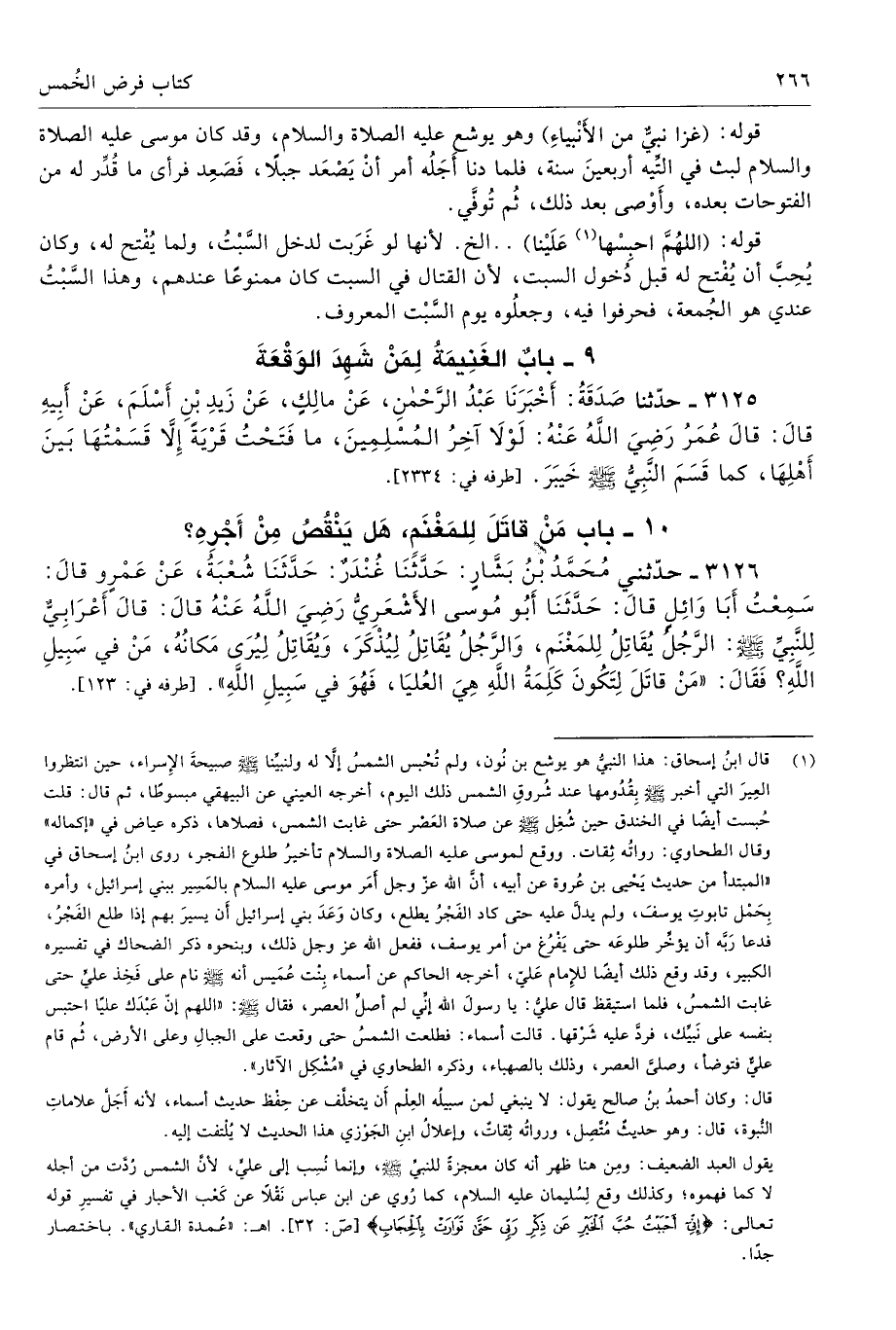 (¬1) قال ابنُ إسحاق: هذا النبيُّ يوشع بن نُون، ولم تُحْبس الشمسُ إلا له ولنبيِّنا - صلى الله عليه وسلم - صبيحةَ الإِسراء، حين انتظروا العِيرَ التي أخبر - صلى الله عليه وسلم - بِقُدُومها عند شُروقِ الشمس ذلك اليوم، أخرجه العيني عن البيهقي مبسوطًا، ثم قال: قلت حُبست أيضًا في الخندق حين شُغِل - صلى الله عليه وسلم - عن صلاة العَصْر حتى غابت الشمس، فصلاها، ذكره عياض في "إكماله" وقال الطحاوي: رواتُه ثِقات. ووقع لموسى عليه الصلاة والسلام تأخيرُ طلوع الفجر، روى ابنُ إسحاق في "المبتدأ من حديث يَحْيى بن عُروة عن أبيه، أن الله عز وجل أمَر موسى عليه السلام بالمَسِير ببني إسرائيل، وأمره بِحَمْل تابوتِ يوسفَ، ولم يدلَّ عليه حتى كاد الفَجْرُ يطلع، وكان وَعَدَ بني إسرائيل أَن يسيرَ بهم إذا طلع الفَجْرُ، فدعا رَبَّه أن بؤخِّر طلوعَه حتى يَفْرُغ من أمر يوسف، ففعل الله عز وجل ذلك، وبنحوه ذكر الضحاك في تفسيره الكبير، وقد وقع ذلك أيضًا للإِمام عَليّ، أخرجه الحاكم عن أسماء بِنت عُمَيس أنه - صلى الله عليه وسلم - نام على فَخِذ عليٍّ حتى غابت الشمسُ، فلما استيقظ قال عليُّ: يا رسولَ الله إنِّي لم أصلِّ العصر، فقال - صلى الله عليه وسلم -: "اللهم إنّ عَبْدَك عليًا احتبس بنفسه على نَبيِّك، فردَّ عليه شَرْقها. قالت أسماء: فطلعت الشمسُ حتى وقعت على الجبالِ وعلى الأرض، ثُم قام عليٌّ فتوضأ، وصلىَّ العصر، وذلك بالصهباء، وذكره الطحاوي في "مُشْكِل الآثار".