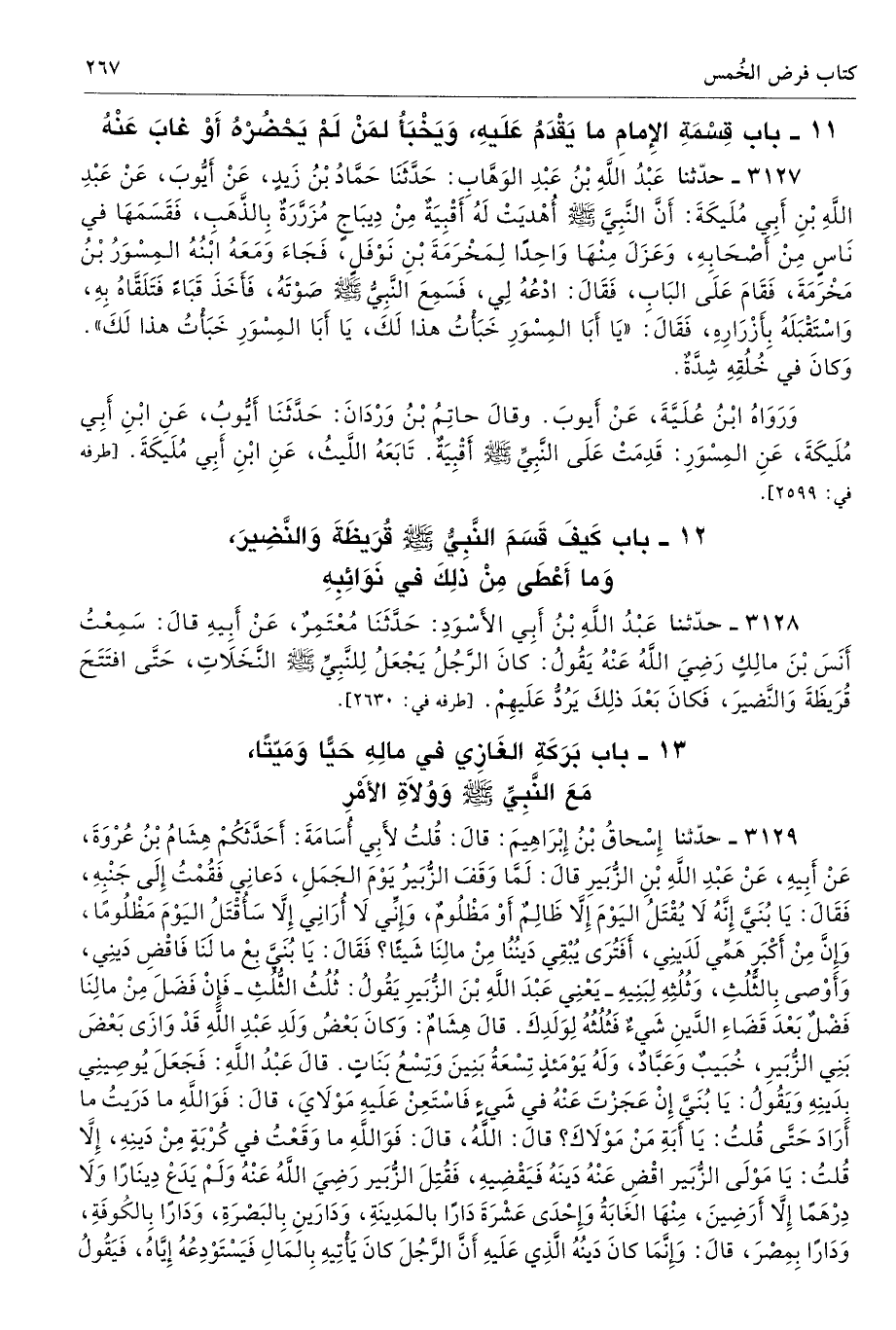 3128 - حَدَّثَنَا عَبْدُ اللَّهِ بْنُ أَبِى الأَسْوَدِ حَدَّثَنَا مُعْتَمِرٌ عَنْ أَبِيهِ قَالَ سَمِعْتُ أَنَسَ بْنَ مَالِكٍ - رضى الله عنه - يَقُولُ كَانَ الرَّجُلُ يَجْعَلُ لِلنَّبِىِّ - صلى الله عليه وسلم - النَّخَلاَتِ حَتَّى افْتَتَحَ قُرَيْظَةَ وَالنَّضِيرَ، فَكَانَ بَعْدَ ذَلِكَ يَرُدُّ عَلَيْهِمْ. أطرافه 2630، 4030، 4120 - تحفة 877