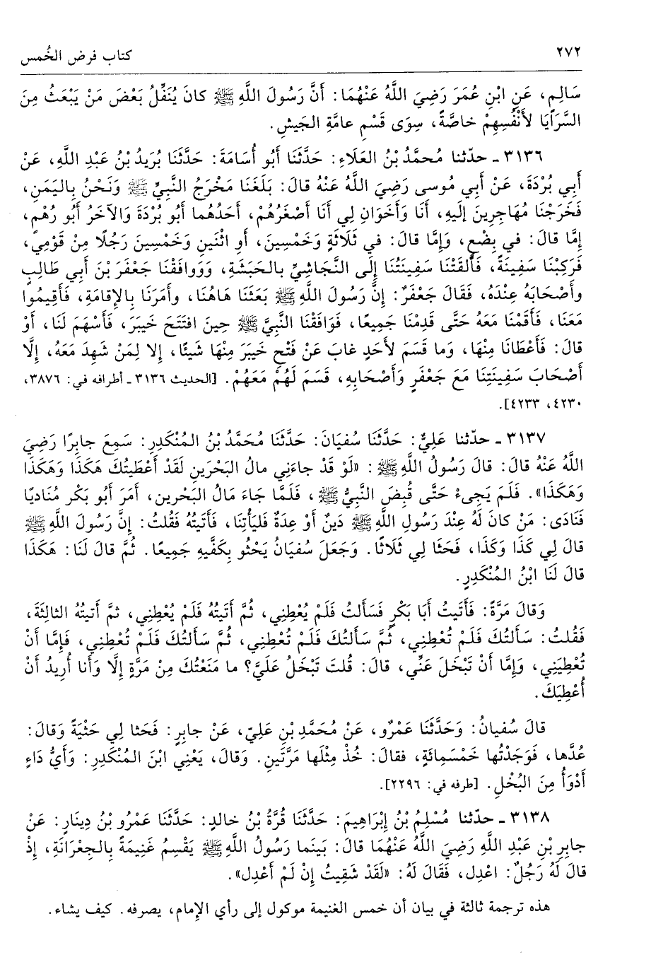 3137 - حَدَّثَنَا عَلِىٌّ حَدَّثَنَا سُفْيَانُ حَدَّثَنَا مُحَمَّدُ بْنُ الْمُنْكَدِرِ سَمِعَ جَابِرًا - رضى الله عنه - قَالَ قَالَ رَسُولُ اللَّهِ - صلى الله عليه وسلم - «لَوْ قَدْ جَاءَنِى مَالُ الْبَحْرَيْنِ لَقَدْ أَعْطَيْتُكَ هَكَذَا وَهَكَذَا وَهَكَذَا». فَلَمْ يَجِئْ حَتَّى قُبِضَ النَّبِىُّ - صلى الله عليه وسلم -، فَلَمَّا جَاءَ مَالُ الْبَحْرَيْنِ أَمَرَ أَبُو بَكْرٍ مُنَادِيًا فَنَادَى مَنْ كَانَ لَهُ عِنْدَ رَسُولِ اللَّهِ - صلى الله عليه وسلم - دَيْنٌ أَوْ عِدَةٌ فَلْيَأْتِنَا. فَأَتَيْتُهُ فَقُلْتُ إِنَّ رَسُولَ اللَّهِ - صلى الله عليه وسلم - قَالَ لِى كَذَا وَكَذَا. فَحَثَا لِى ثَلاَثًا - وَجَعَلَ سُفْيَانُ يَحْثُو بِكَفَّيْهِ جَمِيعًا، ثُمَّ قَالَ لَنَا هَكَذَا قَالَ لَنَا ابْنُ الْمُنْكَدِرِ -.