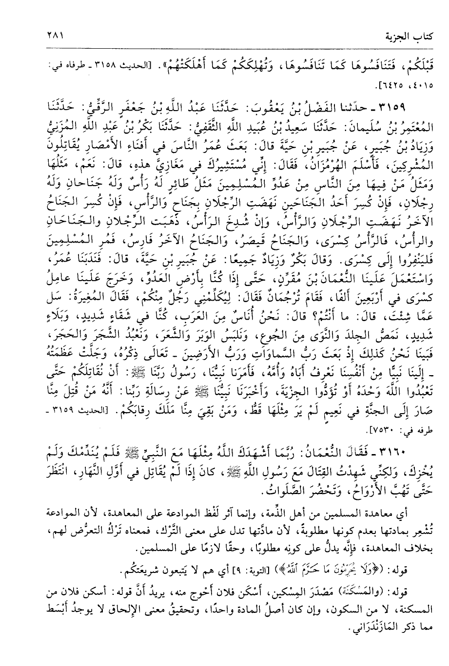 3159 - حَدَّثَنَا الْفَضْلُ بْنُ يَعْقُوبَ حَدَّثَنَا عَبْدُ اللَّهِ بْنُ جَعْفَرٍ الرَّقِّىُّ حَدَّثَنَا الْمُعْتَمِرُ بْنُ سُلَيْمَانَ حَدَّثَنَا سَعِيدُ بْنُ عُبَيْدِ اللَّهِ الثَّقَفِىُّ حَدَّثَنَا بَكْرُ بْنُ عَبْدِ اللَّهِ الْمُزَنِىُّ وَزِيَادُ بْنُ جُبَيْرٍ عَنْ جُبَيْرِ بْنِ حَيَّةَ قَالَ بَعَثَ عُمَرُ النَّاسَ فِى أَفْنَاءِ الأَمْصَارِ يُقَاتِلُونَ الْمُشْرِكِينَ، فَأَسْلَمَ الْهُرْمُزَانُ فَقَالَ إِنِّى مُسْتَشِيرُكَ فِى مَغَازِىَّ هَذِهِ. قَالَ نَعَمْ، مَثَلُهَا وَمَثَلُ مَنْ فِيهَا مِنَ النَّاسِ مِنْ عَدُوِّ الْمُسْلِمِينَ مَثَلُ طَائِرٍ لَهُ رَأْسٌ وَلَهُ جَنَاحَانِ وَلَهُ رِجْلاَنِ، فَإِنْ كُسِرَ أَحَدُ الْجَنَاحَيْنِ نَهَضَتِ الرِّجْلاَنِ بِجَنَاحٍ وَالرَّأْسُ، فَإِنْ كُسِرَ الْجَنَاحُ الآخَرُ نَهَضَتِ الرِّجْلاَنِ وَالرَّأْسُ، وَإِنْ شُدِخَ الرَّأْسُ ذَهَبَتِ الرِّجْلاَنِ وَالْجَنَاحَانِ وَالرَّأْسُ، فَالرَّأْسُ كِسْرَى، وَالْجَنَاحُ قَيْصَرُ، وَالْجَنَاحُ الآخَرُ فَارِسُ، فَمُرِ الْمُسْلِمِينَ فَلْيَنْفِرُوا إِلَى كِسْرَى. وَقَالَ بَكْرٌ وَزِيَادٌ جَمِيعًا عَنْ جُبَيْرِ بْنِ حَيَّةَ قَالَ فَنَدَبَنَا عُمَرُ وَاسْتَعْمَلَ عَلَيْنَا النُّعْمَانَ بْنَ مُقَرِّنٍ، حَتَّى إِذَا كُنَّا بِأَرْضِ الْعَدُوِّ، وَخَرَجَ عَلَيْنَا عَامِلُ كِسْرَى فِى أَرْبَعِينَ أَلْفًا، فَقَامَ تُرْجُمَانٌ فَقَالَ لِيُكَلِّمْنِى رَجُلٌ مِنْكُمْ. فَقَالَ الْمُغِيرَةُ سَلْ عَمَّا شِئْتَ. قَالَ مَا أَنْتُمْ قَالَ نَحْنُ أُنَاسٌ مِنَ الْعَرَبِ كُنَّا فِى شَقَاءٍ شَدِيدٍ وَبَلاَءٍ شَدِيدٍ، نَمَصُّ الْجِلْدَ وَالنَّوَى مِنَ الْجُوعِ، وَنَلْبَسُ الْوَبَرَ وَالشَّعَرَ، وَنَعْبُدُ الشَّجَرَ وَالْحَجَرَ، فَبَيْنَا نَحْنُ كَذَلِكَ، إِذْ بَعَثَ رَبُّ السَّمَوَاتِ وَرَبُّ الأَرَضِينَ تَعَالَى ذِكْرُهُ وَجَلَّتْ عَظَمَتُهُ إِلَيْنَا نَبِيًّا مِنْ أَنْفُسِنَا، نَعْرِفُ أَبَاهُ وَأُمَّهُ، فَأَمَرَنَا نَبِيُّنَا رَسُولُ رَبِّنَا - صلى الله عليه وسلم - أَنْ نَقَاتِلَكُمْ حَتَّى تَعْبُدُوا اللَّهَ وَحْدَهُ أَوْ تُؤَدُّوا الْجِزْيَةَ، وَأَخْبَرَنَا نَبِيُّنَا - صلى الله عليه وسلم - عَنْ رِسَالَةِ رَبِّنَا أَنَّهُ مَنْ قُتِلَ مِنَّا صَارَ إِلَى الْجَنَّةِ فِى نَعِيمٍ لَمْ يَرَ مِثْلَهَا قَطُّ، وَمَنْ بَقِىَ مِنَّا مَلَكَ رِقَابَكُمْ. طرفه 7530 تحفة 11491، 10427