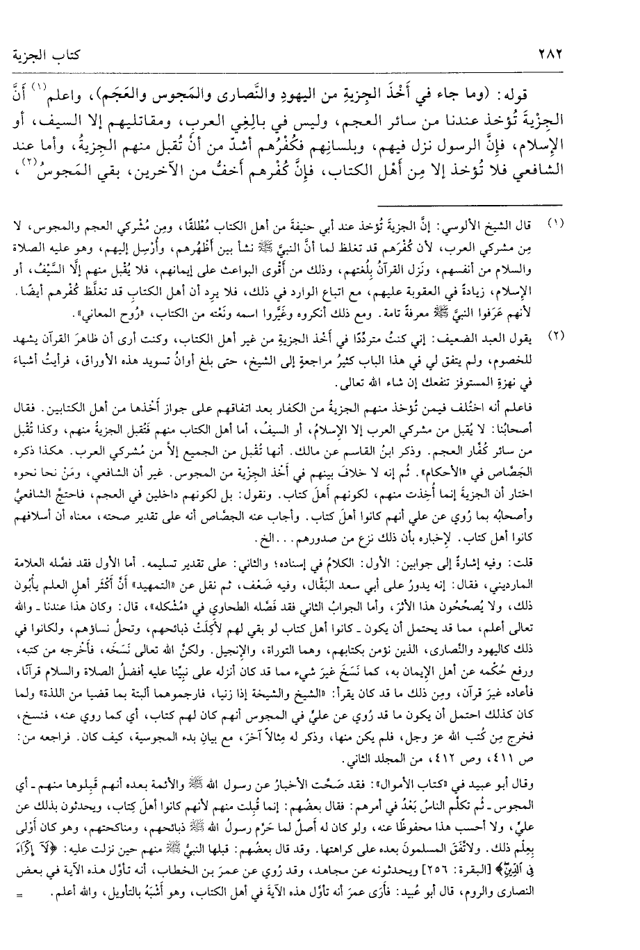 (¬2) يقول العبد الضعيف: إني كنتُ متردِّدًا في أَخْذ الجزيةِ من غير أهل الكتاب، وكنت أرى أن ظاهرَ القرآن يشهد للخصوم، ولم يتفق لي في هذا الباب كثيرُ مراجعةٍ إلى الشيخ، حتى بلغ أوانُ تسويد هذه الأوراق، فرأيتُ أشياءَ في نهزةِ المستوفز تنفعك إن شاء الله تعالى.