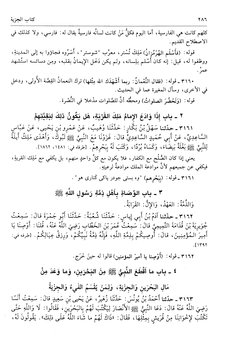 3162 - حَدَّثَنَا آدَمُ بْنُ أَبِى إِيَاسٍ حَدَّثَنَا شُعْبَةُ حَدَّثَنَا أَبُو جَمْرَةَ قَالَ سَمِعْتُ جُوَيْرِيَةَ بْنَ قُدَامَةَ التَّمِيمِىَّ قَالَ سَمِعْتُ عُمَرَ بْنَ الْخَطَّابِ - رضى الله عنه - قُلْنَا أَوْصِنَا يَا أَمِيرَ الْمُؤْمِنِينَ. قَالَ أُوصِيكُمْ بِذِمَّةِ اللَّهِ، فَإِنَّهُ ذِمَّةُ نَبِيِّكُمْ، وَرِزْقُ عِيَالِكُمْ. أطرافه 1392، 3052، 3700، 4888، 7207 تحفة 10429