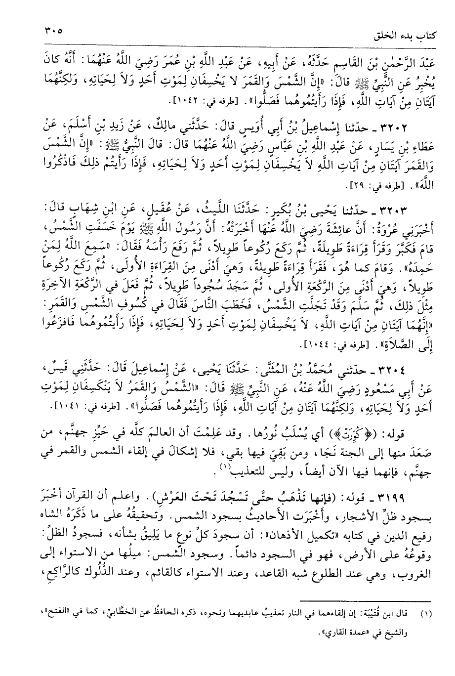 3202 - حَدَّثَنَا إِسْمَاعِيلُ بْنُ أَبِى أُوَيْسٍ قَالَ حَدَّثَنِى مَالِكٌ عَنْ زَيْدِ بْنِ أَسْلَمَ عَنْ عَطَاءِ بْنِ يَسَارٍ عَنْ عَبْدِ اللَّهِ بْنِ عَبَّاسٍ - رضى الله عنهما - قَالَ قَالَ النَّبِىُّ - صلى الله عليه وسلم - «إِنَّ الشَّمْسَ وَالْقَمَرَ آيَتَانِ مِنْ آيَاتِ اللَّهِ، لاَ يَخْسِفَانِ لِمَوْتِ أَحَدٍ وَلاَ لِحَيَاتِهِ، فَإِذَا رَأَيْتُمْ ذَلِكَ فَاذْكُرُوا اللَّهَ». أطرافه 29، 431، 748، 1052، 5197 تحفة 5977