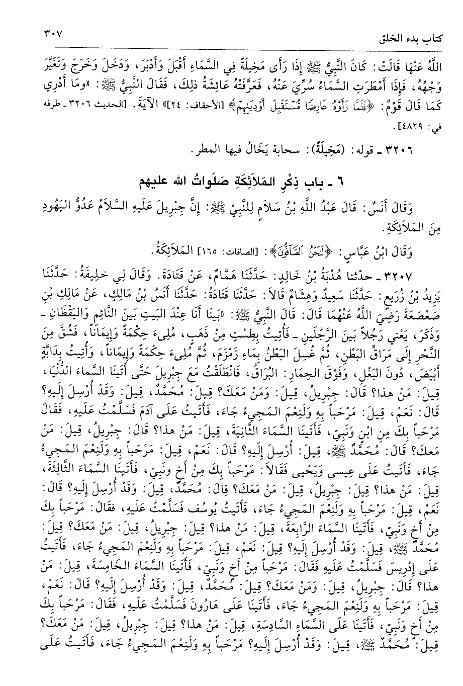 3207 - حَدَّثَنَا هُدْبَةُ بْنُ خَالِدٍ حَدَّثَنَا هَمَّامٌ عَنْ قَتَادَةَ. وَقَالَ لِى خَلِيفَةُ حَدَّثَنَا يَزِيدُ بْنُ زُرَيْعٍ حَدَّثَنَا سَعِيدٌ وَهِشَامٌ قَالاَ حَدَّثَنَا قَتَادَةُ حَدَّثَنَا أَنَسُ بْنُ مَالِكٍ عَنْ مَالِكِ بْنِ صَعْصَعَةَ - رضى الله عنهما - قَالَ قَالَ النَّبِىُّ - صلى الله عليه وسلم - «بَيْنَا أَنَا عِنْدَ الْبَيْتِ بَيْنَ النَّائِمِ وَالْيَقْظَانِ - وَذَكَرَ بَيْنَ الرَّجُلَيْنِ - فَأُتِيتُ بِطَسْتٍ مِنْ ذَهَبٍ مُلِئَ حِكْمَةً وَإِيمَانًا، فَشُقَّ مِنَ النَّحْرِ إِلَى مَرَاقِّ الْبَطْنِ، ثُمَّ غُسِلَ الْبَطْنُ بِمَاءِ زَمْزَمَ، ثُمَّ مُلِئَ حِكْمَةً وَإِيمَانًا، وَأُتِيتُ بِدَابَّةٍ أَبْيَضَ دُونَ الْبَغْلِ وَفَوْقَ الْحِمَارِ الْبُرَاقُ، فَانْطَلَقْتُ مَعَ جِبْرِيلَ حَتَّى أَتَيْنَا السَّمَاءَ الدُّنْيَا قِيلَ مَنْ هَذَا قَالَ جِبْرِيلُ. قِيلَ مَنْ مَعَكَ قِيلَ مُحَمَّدٌ. قِيلَ وَقَدْ أُرْسِلَ إِلَيْهِ قَالَ نَعَمْ. قِيلَ مَرْحَبًا بِهِ، وَلَنِعْمَ الْمَجِىءُ جَاءَ. فَأَتَيْتُ عَلَى آدَمَ، فَسَلَّمْتُ عَلَيْهِ، فَقَالَ مَرْحَبًا بِكَ مِنِ ابْنٍ وَنَبِىٍّ. فَأَتَيْنَا السَّمَاءَ الثَّانِيَةَ، قِيلَ مَنْ هَذَا قَالَ جِبْرِيلُ. قِيلَ مَنْ مَعَكَ قَالَ مُحَمَّدٌ - صلى الله عليه وسلم -. قِيلَ أُرْسِلَ إِلَيْهِ قَالَ نَعَمْ. قِيلَ مَرْحَبًا بِهِ، وَلَنِعْمَ الْمَجِىءُ جَاءَ. فَأَتَيْتُ عَلَى عِيسَى وَيَحْيَى فَقَالاَ مَرْحَبًا بِكَ مِنْ أَخٍ وَنَبِىٍّ. فَأَتَيْنَا السَّمَاءَ الثَّالِثَةَ، قِيلَ مَنْ هَذَا قِيلَ جِبْرِيلُ. قِيلَ مَنْ مَعَكَ قِيلَ مُحَمَّدٌ. قِيلَ وَقَدْ أُرْسِلَ إِلَيْهِ قَالَ نَعَمْ. قِيلَ مَرْحَبًا بِهِ وَلَنِعْمَ الْمَجِىءُ جَاءَ. فَأَتَيْتُ يُوسُفَ فَسَلَّمْتُ عَلَيْهِ، قَالَ مَرْحَبًا بِكَ مِنْ أَخٍ وَنَبِىٍّ فَأَتَيْنَا السَّمَاءَ الرَّابِعَةَ، قِيلَ مَنْ هَذَا قِيلَ جِبْرِيلُ. قِيلَ مَنْ مَعَكَ قِيلَ مُحَمَّدٌ - صلى الله عليه وسلم -. قِيلَ وَقَدْ أُرْسِلَ إِلَيْهِ قِيلَ نَعَمْ. قِيلَ مَرْحَبًا بِهِ، وَلَنِعْمَ الْمَجِىءُ جَاءَ. فَأَتَيْتُ عَلَى إِدْرِيسَ فَسَلَّمْتُ عَلَيْهِ، فَقَالَ مَرْحَبًا مِنْ أَخٍ وَنَبِىٍّ. فَأَتَيْنَا السَّمَاءَ الْخَامِسَةَ، قِيلَ مَنْ هَذَا قَالَ جِبْرِيلُ. قِيلَ وَمَنْ مَعَكَ قِيلَ مُحَمَّدٌ. قِيلَ وَقَدْ أُرْسِلَ إِلَيْهِ قَالَ نَعَمْ. قِيلَ مَرْحَبًا بِهِ، وَلَنِعْمَ الْمَجِىءُ جَاءَ. فَأَتَيْنَا عَلَى هَارُونَ، فَسَلَّمْتُ عَلَيْهِ فَقَالَ مَرْحَبًا بِكَ مِنْ أَخٍ وَنَبِىٍّ. فَأَتَيْنَا عَلَى السَّمَاءِ السَّادِسَةِ، قِيلَ مَنْ هَذَا قِيلَ جِبْرِيلُ. قِيلَ مَنْ مَعَكَ قَالَ مُحَمَّدٌ - صلى الله عليه وسلم -. قِيلَ وَقَدْ أُرْسِلَ إِلَيْهِ مَرْحَبًا بِهِ، وَلَنِعْمَ الْمَجِىءُ جَاءَ. فَأَتَيْتُ عَلَى