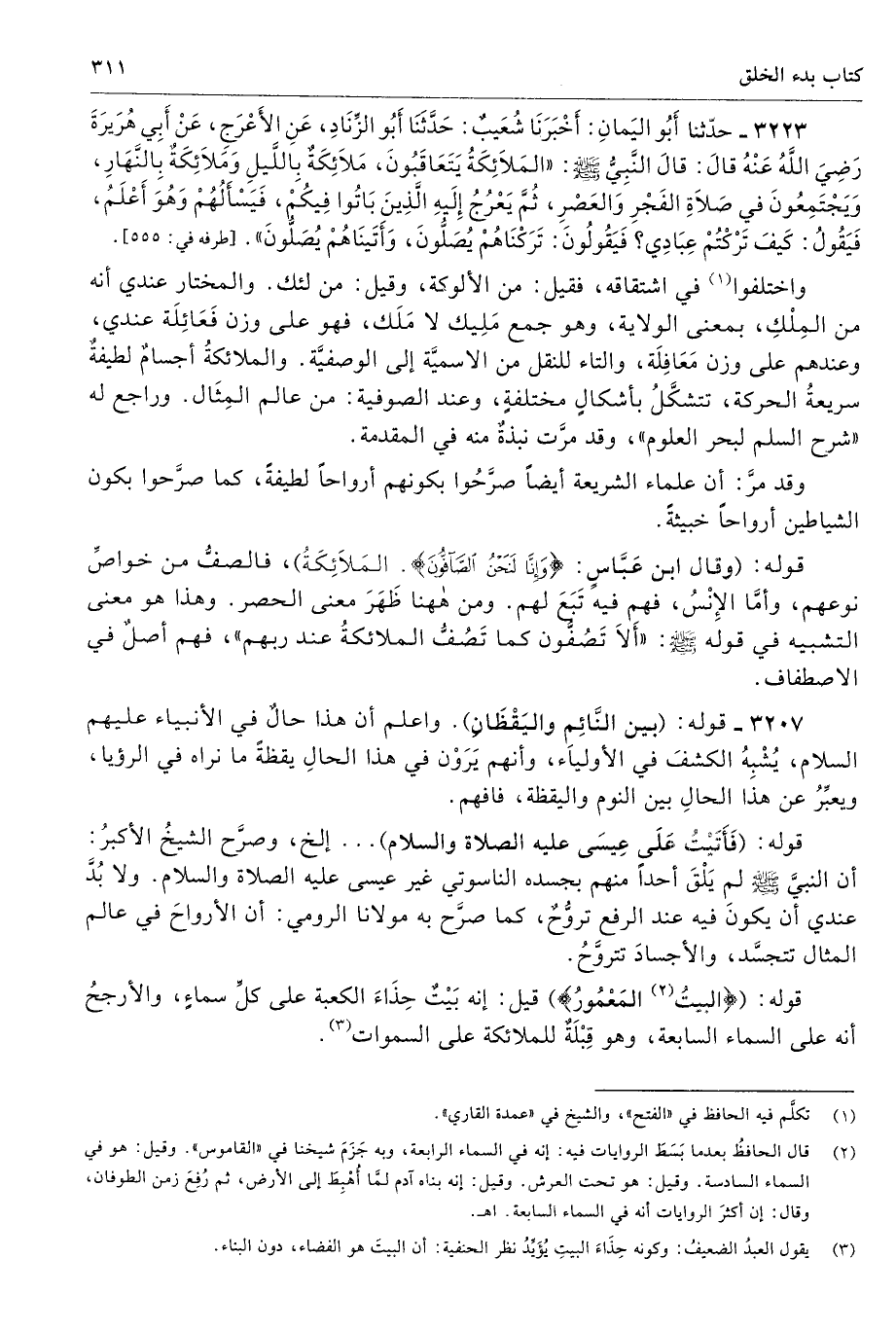 3223 - حَدَّثَنَا أَبُو الْيَمَانِ أَخْبَرَنَا شُعَيْبٌ حَدَّثَنَا أَبُو الزِّنَادِ عَنِ الأَعْرَجِ عَنْ أَبِى هُرَيْرَةَ - رضى الله عنه - قَالَ قَالَ النَّبِىُّ - صلى الله عليه وسلم - «الْمَلاَئِكَةُ يَتَعَاقَبُونَ، مَلاَئِكَةٌ بِاللَّيْلِ وَمَلاَئِكَةٌ بِالنَّهَارِ، وَيَجْتَمِعُونَ فِى صَلاَةِ الْفَجْرِ وَالْعَصْرِ، ثُمَّ يَعْرُجُ إِلَيْهِ الَّذِينَ بَاتُوا فِيكُمْ، فَيَسْأَلُهُمْ وَهْوَ أَعْلَمُ، فَيَقُولُ كَيْفَ تَرَكْتُمْ {عِبَادِى} فَيَقُولُونَ تَرَكْنَاهُمْ يُصَلُّونَ، وَأَتَيْنَاهُمْ يُصَلُّونَ». أطرافه 555، 7429، 7486 تحفة 13737