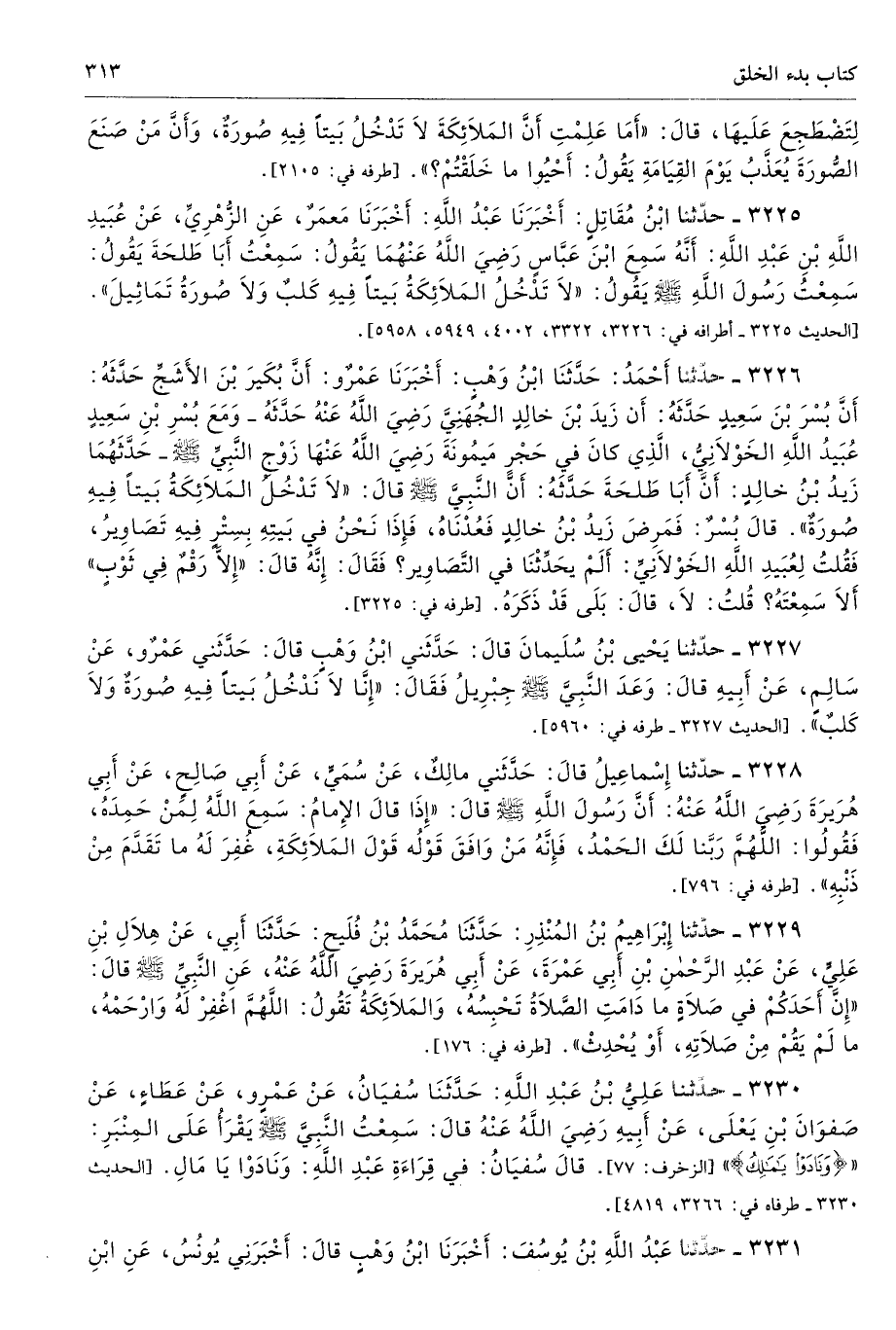 3226 - حَدَّثَنَا أَحْمَدُ حَدَّثَنَا ابْنُ وَهْبٍ أَخْبَرَنَا عَمْرٌو أَنَّ بُكَيْرَ بْنَ الأَشَجِّ حَدَّثَهُ أَنَّ بُسْرَ بْنَ سَعِيدٍ حَدَّثَهُ أَنَّ زَيْدَ بْنَ خَالِدٍ الْجُهَنِىَّ - رضى الله عنه - حَدَّثَهُ وَمَعَ بُسْرِ بْنِ سَعِيدٍ عُبَيْدُ اللَّهِ الْخَوْلاَنِىُّ الَّذِى كَانَ فِى حَجْرِ مَيْمُونَةَ - رضى الله عنها - زَوْجِ النَّبِىِّ - صلى الله عليه وسلم - حَدَّثَهُمَا زَيْدُ بْنُ خَالِدٍ أَنَّ أَبَا طَلْحَةَ حَدَّثَهُ أَنَّ النَّبِىَّ - صلى الله عليه وسلم - قَالَ «لاَ تَدْخُلُ الْمَلاَئِكَةُ بَيْتًا فِيهِ صُورَةٌ». قَالَ بُسْرٌ فَمَرِضَ زَيْدُ بْنُ خَالِدٍ، فَعُدْنَاهُ فَإِذَا نَحْنُ فِى بَيْتِهِ بِسِتْرٍ فِيهِ تَصَاوِيرُ، فَقُلْتُ لِعُبَيْدِ اللَّهِ الْخَوْلاَنِىِّ أَلَمْ يُحَدِّثْنَا فِى التَّصَاوِيرِ فَقَالَ إِنَّهُ قَالَ «إِلاَّ رَقْمٌ فِى ثَوْبٍ». أَلاَ سَمِعْتَهُ قُلْتُ لاَ. قَالَ بَلَى قَدْ ذَكَرَهُ. أطرافه 3225، 3322، 4002، 5949، 5958 تحفة 3775، 3754 أ - 139/ 4