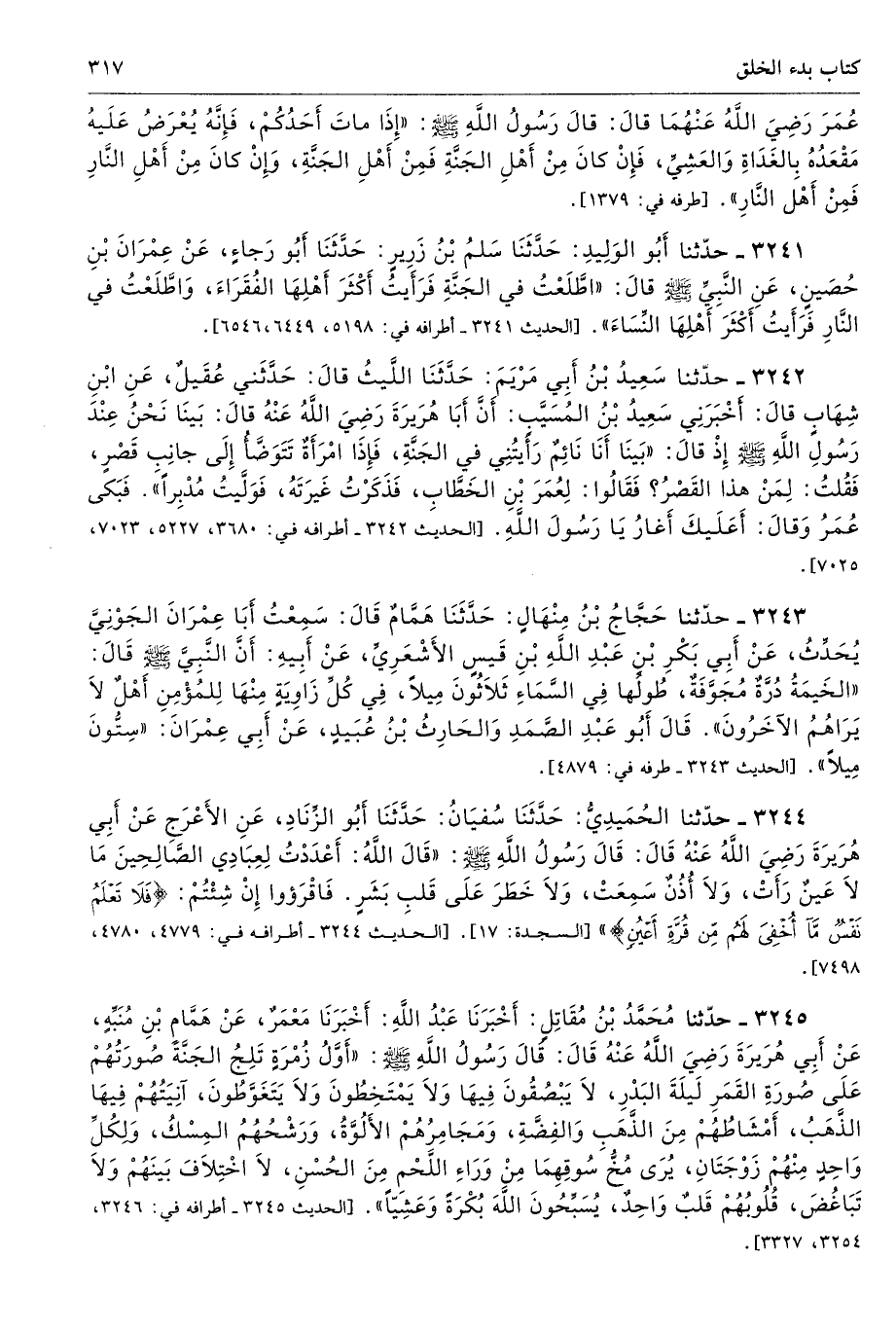 3244 - حَدَّثَنَا الْحُمَيْدِىُّ حَدَّثَنَا سُفْيَانُ حَدَّثَنَا أَبُو الزِّنَادِ عَنِ الأَعْرَجِ عَنْ أَبِى هُرَيْرَةَ - رضى الله عنه - قَالَ قَالَ رَسُولُ اللَّهِ - صلى الله عليه وسلم - «قَالَ اللَّهُ أَعْدَدْتُ لِعِبَادِى الصَّالِحِينَ مَا لاَ عَيْنَ رَأَتْ، وَلاَ أُذُنَ سَمِعَتْ، وَلاَ خَطَرَ عَلَى قَلْبِ بَشَرٍ، فَاقْرَءُوا إِنْ شِئْتُمْ {فَلَا تَعْلَمُ نَفْسٌ مَا أُخْفِيَ لَهُمْ مِنْ قُرَّةِ أَعْيُنٍ} [السجدة: 17]. أطرافه 4779، 4780، 7498 تحفة 13675