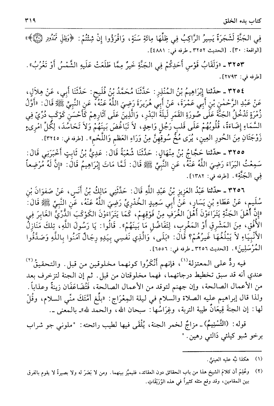 3254 - حَدَّثَنَا إِبْرَاهِيمُ بْنُ الْمُنْذِرِ حَدَّثَنَا مُحَمَّدُ بْنُ فُلَيْحٍ حَدَّثَنَا أَبِى عَنْ هِلاَلٍ عَنْ عَبْدِ الرَّحْمَنِ بْنِ أَبِى عَمْرَةَ عَنْ أَبِى هُرَيْرَةَ - رضى الله عنه - عَنِ النَّبِىِّ - صلى الله عليه وسلم - «أَوَّلُ زُمْرَةٍ تَدْخُلُ الْجَنَّةَ عَلَى صُورَةِ الْقَمَرِ لَيْلَةَ الْبَدْرِ، وَالَّذِينَ عَلَى آثَارِهِمْ كَأَحْسَنِ كَوْكَبٍ دُرِّىٍّ فِى السَّمَاءِ إِضَاءَةً، قُلُوبُهُمْ عَلَى قَلْبِ رَجُلٍ وَاحِدٍ، لاَ تَبَاغُضَ بَيْنَهُمْ وَلاَ تَحَاسُدَ، لِكُلِّ امْرِئٍ زَوْجَتَانِ مِنَ الْحُورِ الْعِينِ، يُرَى مُخُّ سُوقِهِنَّ مِنْ وَرَاءِ الْعَظْمِ وَاللَّحْمِ». أطرافه 3245، 3246، 3327 تحفة 13612 - 145/ 4