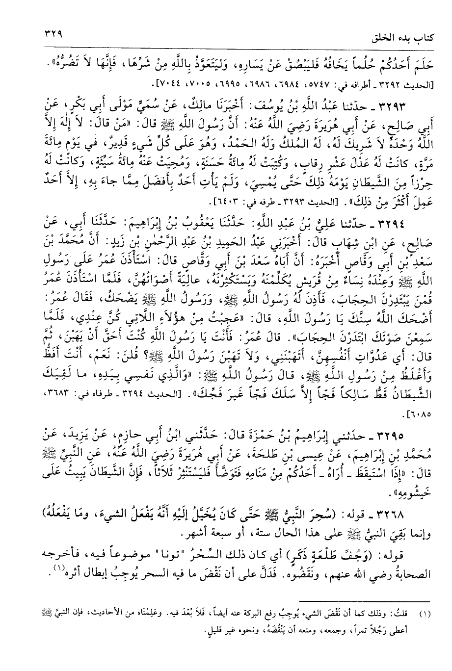 حَلَمَ أَحَدُكُمْ حُلُمًا يَخَافُهُ فَلْيَبْصُقْ عَنْ يَسَارِهِ، وَلْيَتَعَوَّذْ بِاللَّهِ مِنْ شَرِّهَا، فَإِنَّهَا لاَ تَضُرُّهُ». أطرافه 5747، 6984، 6986، 6995، 6996، 7005، 7044 تحفة 12112