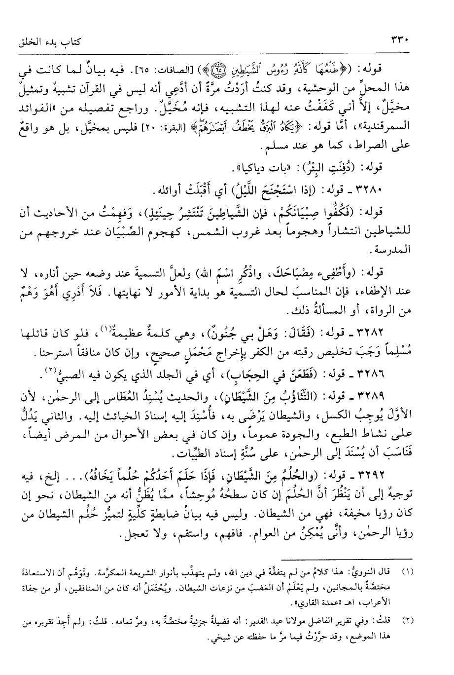 3292 - قوله: (والحُلُمُ مِنَ الشَّيْطَانِ، فَإذَا حَلَمَ أَحَدُكُمْ حُلُمًا يَخَافُهُ) ... إلخ، فيه توجيهٌ إلى أن يَنْظُرَ أنَّ الحُلُمَ إن كان سطحُهُ مُوحِشًا، ممَّا يُظَنُّ أنه من الشيطان، نحو أن كان رؤيا مخيفةً، فهي من الشيطان. وليس فيه بيانُ ضابطةٍ كلِّيةٍ لتميُّز حُلُم الشيطان من رؤيا الرحمن، وأنَّى يُمْكِنُ من العوام. فافهم، واستقم، ولا تعجل.