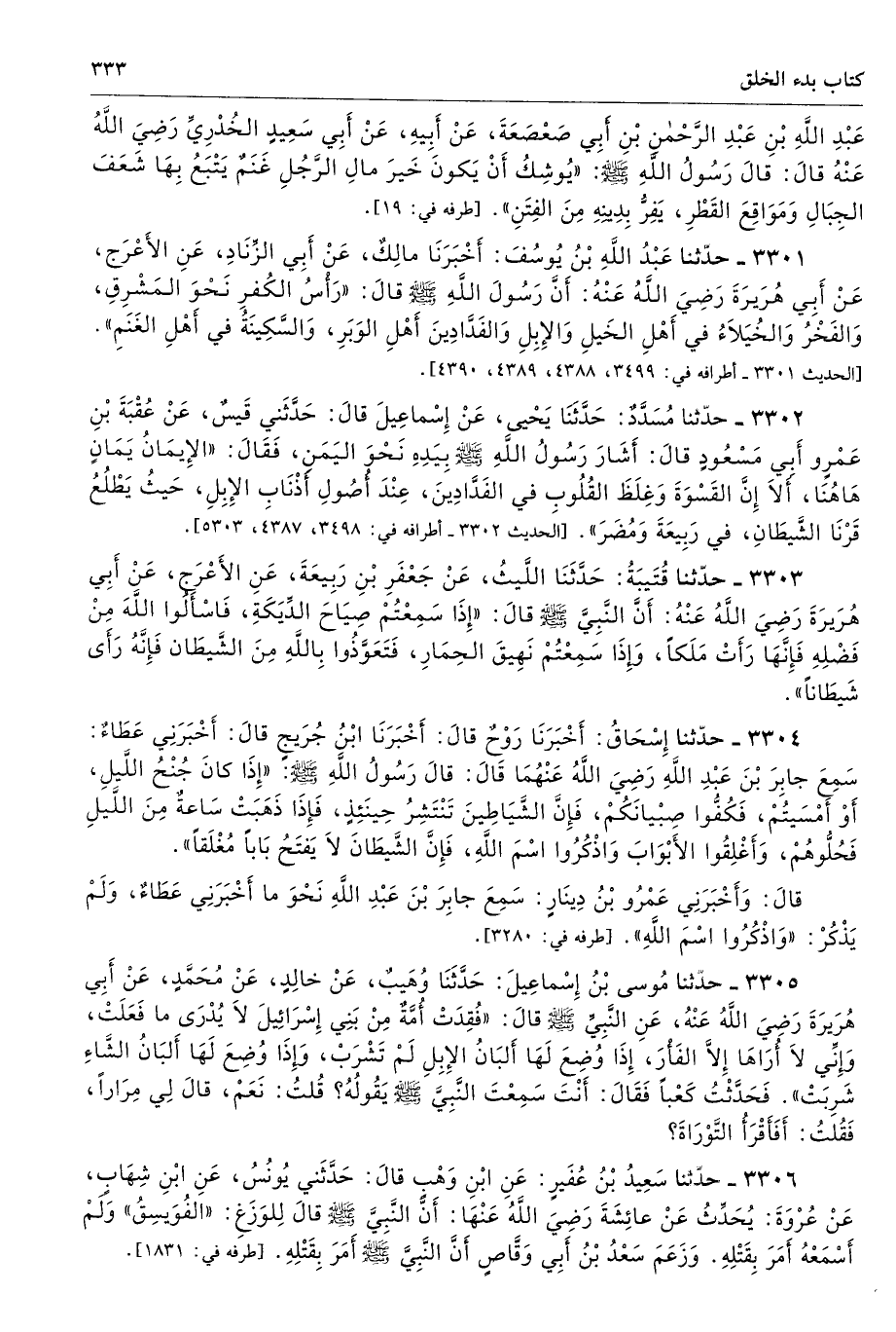 عَبْدِ اللَّهِ بْنِ عَبْدِ الرَّحْمَنِ بْنِ أَبِى صَعْصَعَةَ عَنْ أَبِيهِ عَنْ أَبِى سَعِيدٍ الْخُدْرِىِّ - رضى الله عنه - قَالَ قَالَ رَسُولُ اللَّهِ - صلى الله عليه وسلم - «يُوشِكُ أَنْ يَكُونَ خَيْرَ مَالِ الرَّجُلِ غَنَمٌ يَتْبَعُ بِهَا شَعَفَ الْجِبَالِ وَمَوَاقِعَ الْقَطْرِ، يَفِرُّ بِدِينِهِ مِنَ الْفِتَنِ». أطرافه 19، 3600، 6495، 7088 تحفة 4103