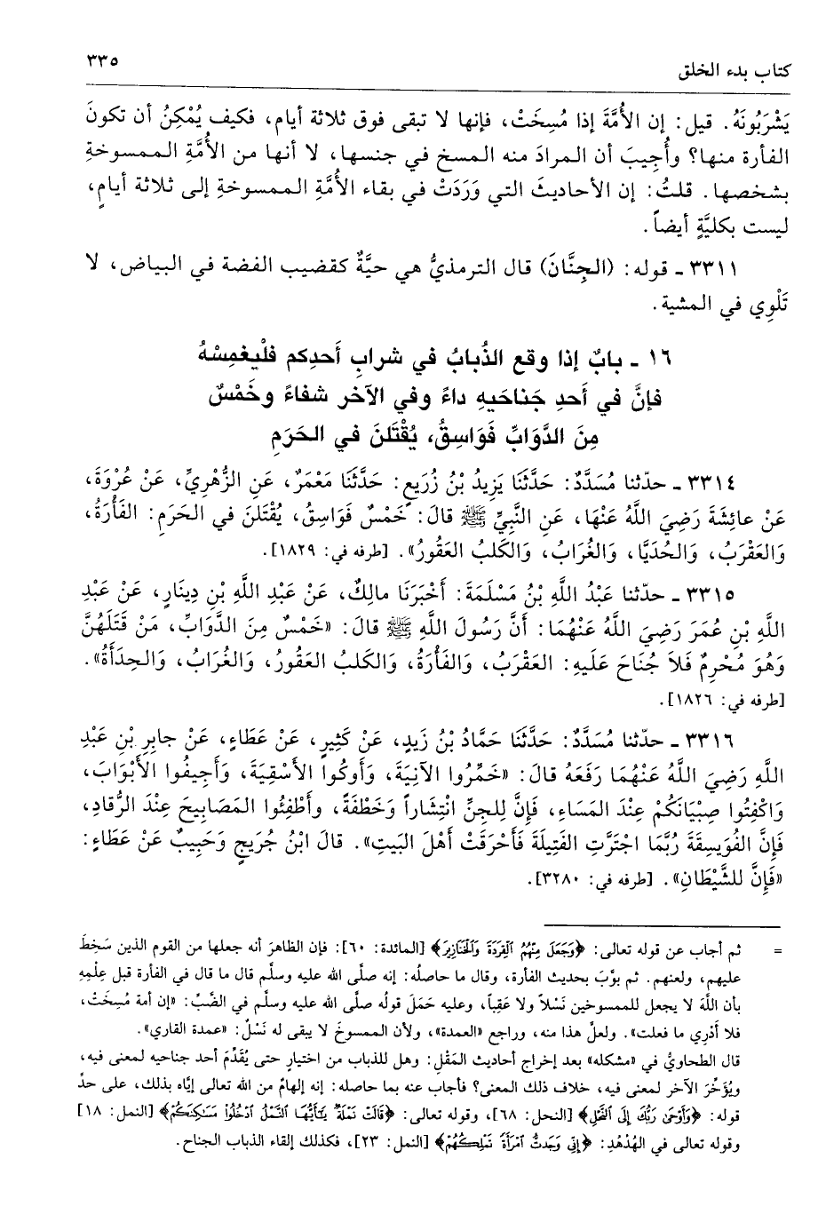 = ثم أجاب عن قوله تعالى: {وَجَعَلَ مِنْهُمُ الْقِرَدَةَ وَالْخَنَازِيرَ} [المائدة: 60]: فإن الظاهرَ أنه جعلها من القوم الذين سَخِطَ عليهم، ولعنهم. ثم بوَّبَ بحديث الفأرة، وقال ما حاصلُه: إنه صلَّى الله عليه وسلَّم قال ما قال في الفأرة قبل عِلْمِهِ بأن اللهَ لا يجعل للممسوخين نَسْلًا ولا عَقِبًا، وعليه حَمَلَ قولُه صلى الله عليه وسلم في الضَّبِّ: "إن أمة مُسِخَتْ، فلا أَدْرِي ما فعلت". ولعلَّ هذا منه، وراجع "العمدة"، ولأن الممسوخَ لا يبقى له نَسْلٌ: "عمدة القاري".