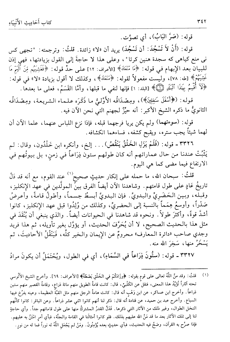 3326 - قوله: (فَلَمْ يَزَلِ الخَلْقُ يَنْقُصُ) ... إلخ، وأنكره ابن خَلْدُون، وقال: لم يَثْبُتْ عندنا من حال عماراتهم أنه كان طولهم ستون ذِرَاعًا في زمنٍ، بل بيوتُهم في الارتفاع فيما مضى كما هي اليوم.