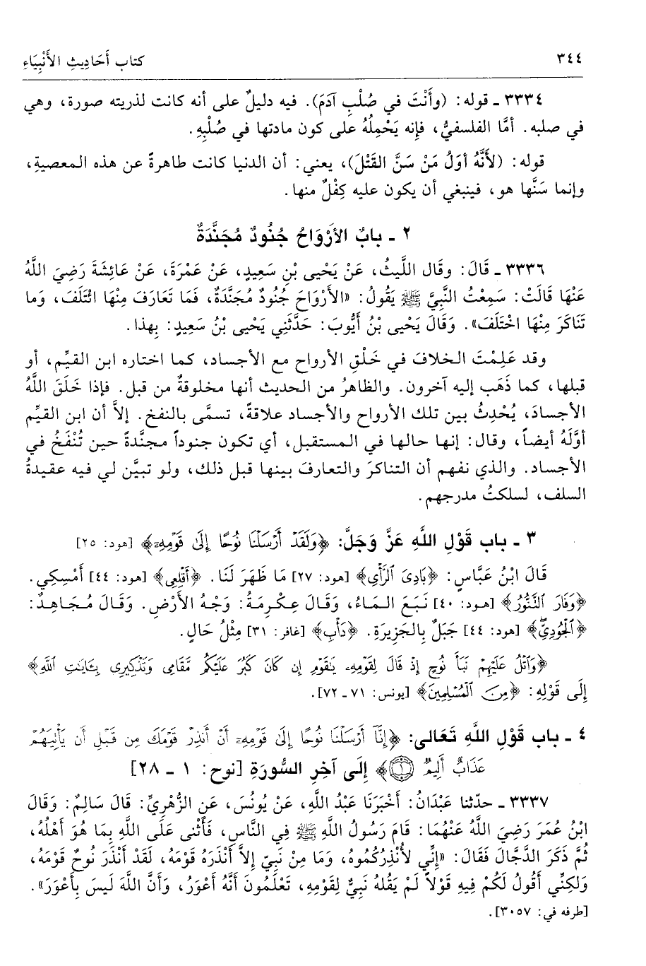 3334 - قوله: (وأَنْتَ في صُلْبِ آَدَمَ) فيه دليلٌ على أنه كانت لذريته صورة، وهي في صلبه. أمَّا الفلسفيُّ، فإِنه يَحْمِلُهُ على كون مادتها في صُلْبِهِ.