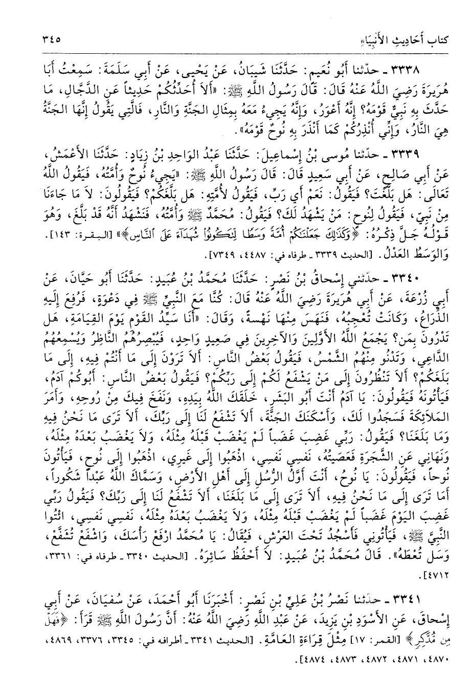 3340 - حَدَّثَنِى إِسْحَاقُ بْنُ نَصْرٍ حَدَّثَنَا مُحَمَّدُ بْنُ عُبَيْدٍ حَدَّثَنَا أَبُو حَيَّانَ عَنْ أَبِى زُرْعَةَ عَنْ أَبِى هُرَيْرَةَ - رضى الله عنه - قَالَ كُنَّا مَعَ النَّبِىِّ - صلى الله عليه وسلم - فِى دَعْوَةٍ، فَرُفِعَ إِلَيْهِ الذِّرَاعُ، وَكَانَتْ تُعْجِبُهُ، فَنَهَسَ مِنْهَا نَهْسَةً وَقَالَ «أَنَا سَيِّدُ الْقَوْمِ يَوْمَ الْقِيَامَةِ، هَلْ تَدْرُونَ بِمَنْ يَجْمَعُ اللَّهُ الأَوَّلِينَ وَالآخِرِينَ فِى صَعِيدٍ وَاحِدٍ فَيُبْصِرُهُمُ النَّاظِرُ وَيُسْمِعُهُمُ الدَّاعِى، وَتَدْنُو مِنْهُمُ الشَّمْسُ، فَيَقُولُ بَعْضُ النَّاسِ أَلاَ تَرَوْنَ إِلَى مَا أَنْتُمْ فِيهِ، إِلَى مَا بَلَغَكُمْ، أَلاَ تَنْظُرُونَ إِلَى مَنْ يَشْفَعُ لَكُمْ إِلَى رَبِّكُمْ فَيَقُولُ بَعْضُ النَّاسِ أَبُوكُمْ آدَمُ، فَيَأْتُونَهُ فَيَقُولُونَ يَا آدَمُ أَنْتَ أَبُو الْبَشَرِ، خَلَقَكَ اللَّهُ بِيَدِهِ وَنَفَخَ فِيكَ مِنْ رُوحِهِ، وَأَمَرَ الْمَلاَئِكَةَ فَسَجَدُوا لَكَ، وَأَسْكَنَكَ الْجَنَّةَ، أَلاَ تَشْفَعُ لَنَا إِلَى رَبِّكَ أَلاَ تَرَى مَا نَحْنُ فِيهِ وَمَا بَلَغَنَا فَيَقُولُ رَبِّى غَضِبَ غَضَبًا لَمْ يَغْضَبْ قَبْلَهُ مِثْلَهُ، وَلاَ يَغْضَبُ بَعْدَهُ مِثْلَهُ، وَنَهَانِى عَنِ الشَّجَرَةِ فَعَصَيْتُهُ، نَفْسِى نَفْسِى، اذْهَبُوا إِلَى غَيْرِى، اذْهَبُوا إِلَى نُوحٍ. فَيَأْتُونَ نُوحًا فَيَقُولُونَ يَا نُوحُ أَنْتَ أَوَّلُ الرُّسُلِ إِلَى أَهْلِ الأَرْضِ، وَسَمَّاكَ اللَّهُ عَبْدًا شَكُورًا، أَمَا تَرَى إِلَى مَا نَحْنُ فِيهِ أَلاَ تَرَى إِلَى مَا بَلَغَنَا أَلاَ تَشْفَعُ لَنَا إِلَى رَبِّكَ فَيَقُولُ رَبِّى غَضِبَ الْيَوْمَ غَضَبًا لَمْ يَغْضَبْ قَبْلَهُ مِثْلَهُ، وَلاَ يَغْضَبُ بَعْدَهُ مِثْلَهُ، نَفْسِى نَفْسِى، ائْتُوا النَّبِىَّ - صلى الله عليه وسلم -، فَيَأْتُونِى، فَأَسْجُدُ تَحْتَ الْعَرْشِ فَيُقَالُ يَا مُحَمَّدُ ارْفَعْ رَأْسَكَ وَاشْفَعْ تُشَفَّعْ، وَسَلْ تُعْطَهُ». قَالَ مُحَمَّدُ بْنُ عُبَيْدٍ لاَ أَحْفَظُ سَائِرَهُ. طرفاه 3361، 4712 تحفة 14927 - 164/ 4