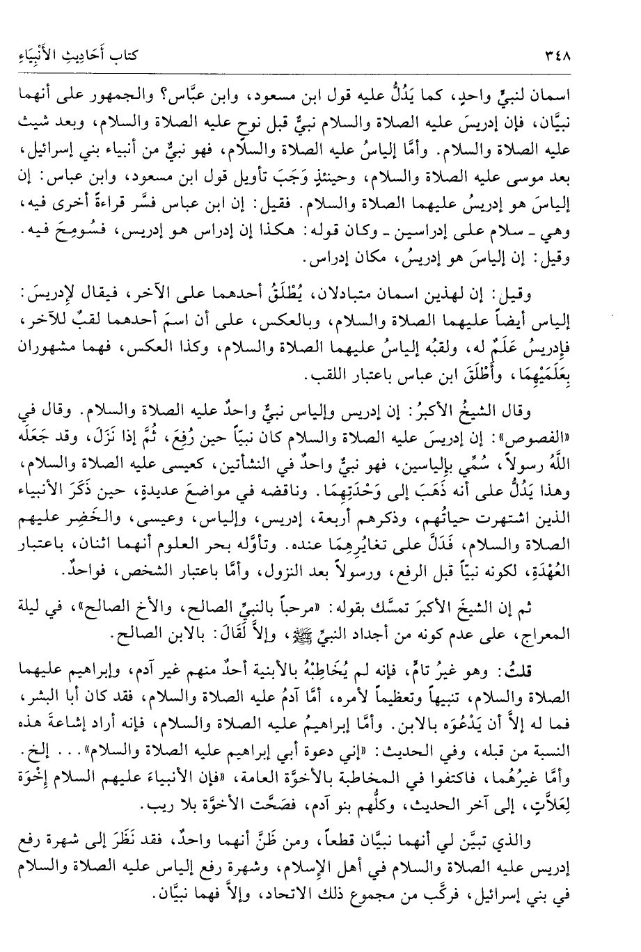 وقال الشيخُ الأكبرُ: إن إدريس وإلياس نبيٌّ واحدٌ عليه الصلاة والسلام. وقال في «الفصوص»: إن إدريسَ عليه الصلاة والسلام كان نبيًّا حين رُفِعَ، ثُمَّ إذا نَزَلَ، وقد جَعَلَه اللَّهُ رسولًا، سُمِّي بإِلياسين، فهو نبيٌّ واحدٌ في النشأتين، كعيسى عليه الصلاة والسلام، وهذا يَدُلُّ على أنه ذَهَبَ إلى وَحْدَتِهِمَا. وناقضه في مواضعَ عديدةٍ، حين ذَكَرَ الذين اشتهرت حياتُهم، وذكرهم أربعة، إدريس، وإلياس، وعيسى، والخَضِر عليهم الصلاة والسلام، فَدَلَّ على تغايُرِهِمَا عنده. وتأوَّله بحر العلوم أنهما اثنان، باعتبار العُهْدَةِ، لكونه نبيًّا قبل الرفع، ورسولًا بعد النزول، وأمَّا باعتبار الشخص، فواحدٌ.