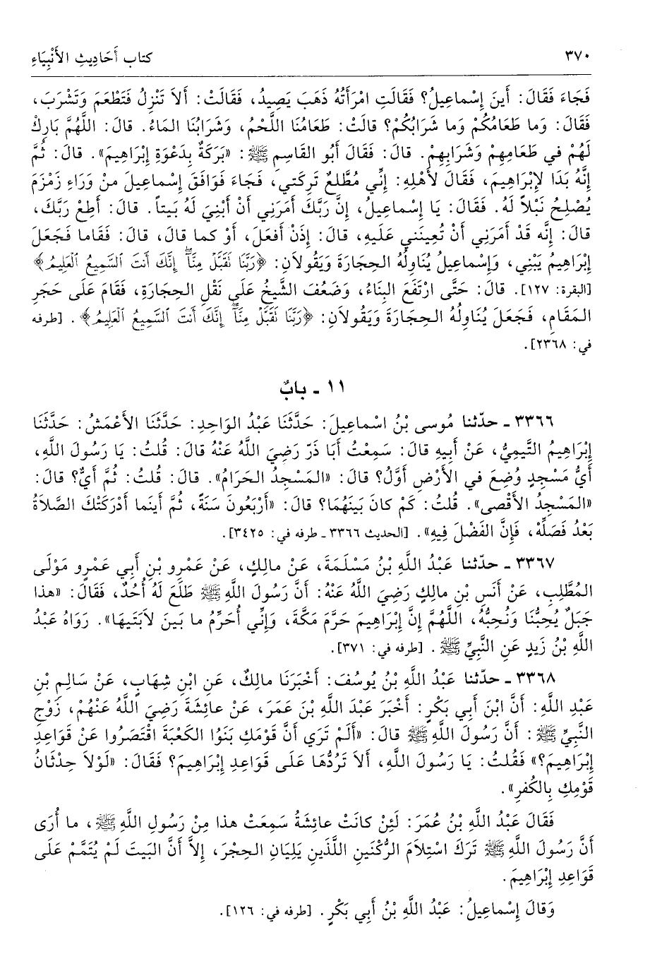 3368 - حَدَّثَنَا عَبْدُ اللَّهِ بْنُ يُوسُفَ أَخْبَرَنَا مَالِكٌ عَنِ ابْنِ شِهَابٍ عَنْ سَالِمِ بْنِ عَبْدِ اللَّهِ أَنَّ ابْنَ أَبِى بَكْرٍ أَخْبَرَ عَبْدَ اللَّهِ بْنَ عُمَرَ عَنْ عَائِشَةَ - رضى الله عنهم - زَوْجِ النَّبِىِّ - صلى الله عليه وسلم - أَنَّ رَسُولَ اللَّهِ - صلى الله عليه وسلم - قَالَ «أَلَمْ تَرَىْ أَنَّ قَوْمَكِ بَنَوُا الْكَعْبَةَ اقْتَصَرُوا عَنْ قَوَاعِدِ إِبْرَاهِيمَ». فَقُلْتُ يَا رَسُولَ اللَّهِ، أَلاَ تَرُدُّهَا عَلَى قَوَاعِدِ إِبْرَاهِيمَ. فَقَالَ «لَوْلاَ حِدْثَانُ قَوْمِكِ بِالْكُفْرِ».