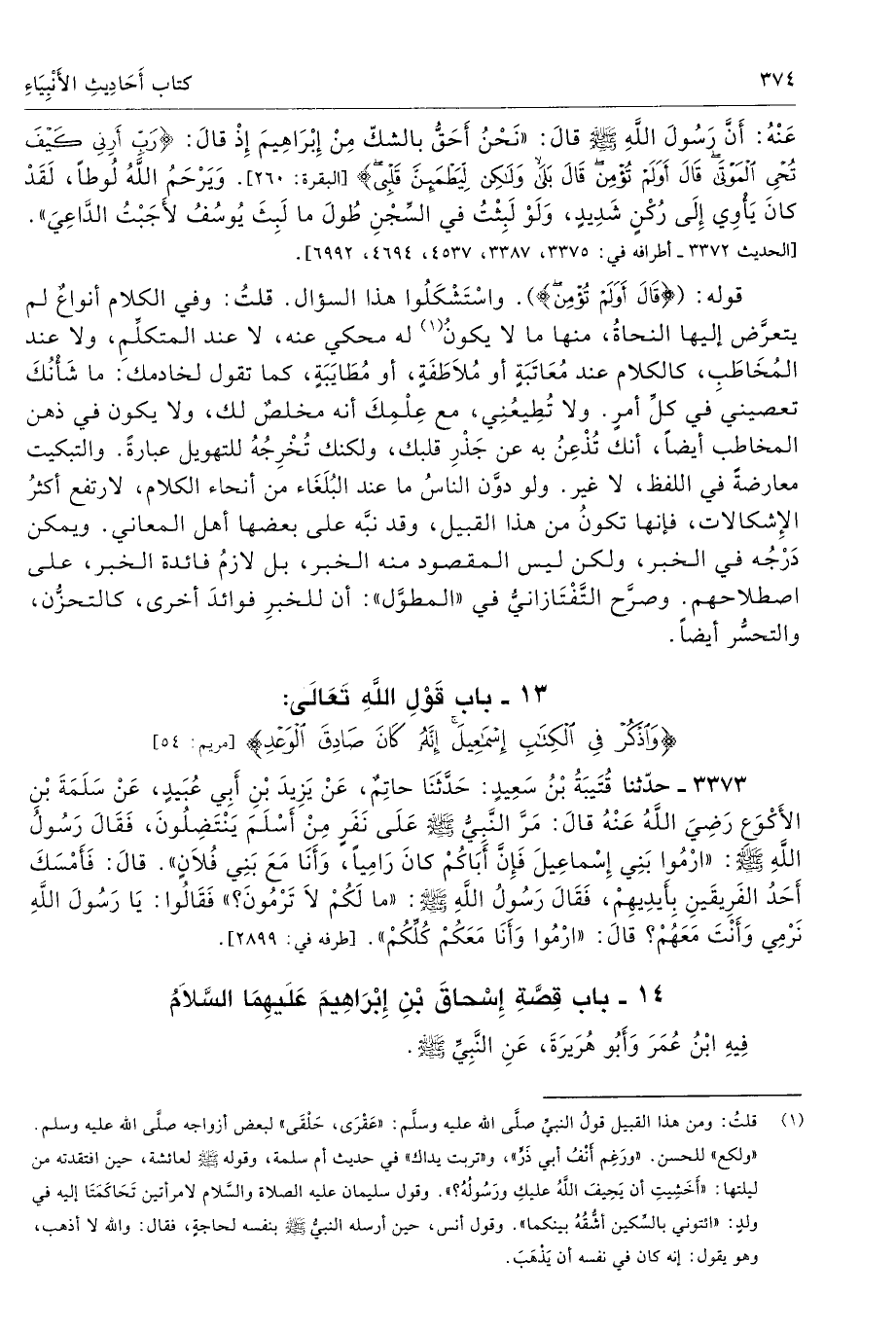 عنه - أَنَّ رَسُولَ اللَّهِ - صلى الله عليه وسلم - قَالَ «نَحْنُ أَحَقُّ مِنْ إِبْرَاهِيمَ إِذْ قَالَ {رَبِّ أَرِنِي كَيْفَ تُحْيِ الْمَوْتَى قَالَ أَوَلَمْ تُؤْمِنْ قَالَ بَلَى وَلَكِنْ لِيَطْمَئِنَّ قَلْبِي} [البقرة: 260] وَيَرْحَمُ اللَّهُ لُوطًا، لَقَدْ كَانَ يَأْوِى إِلَى رُكْنٍ شَدِيدٍ وَلَوْ لَبِثْتُ فِى السِّجْنِ طُولَ مَا لَبِثَ يُوسُفُ لأَجَبْتُ الدَّاعِىَ». أطرافه 3375، 3387، 4537، 4694، 6992 تحفة 13325، 15313